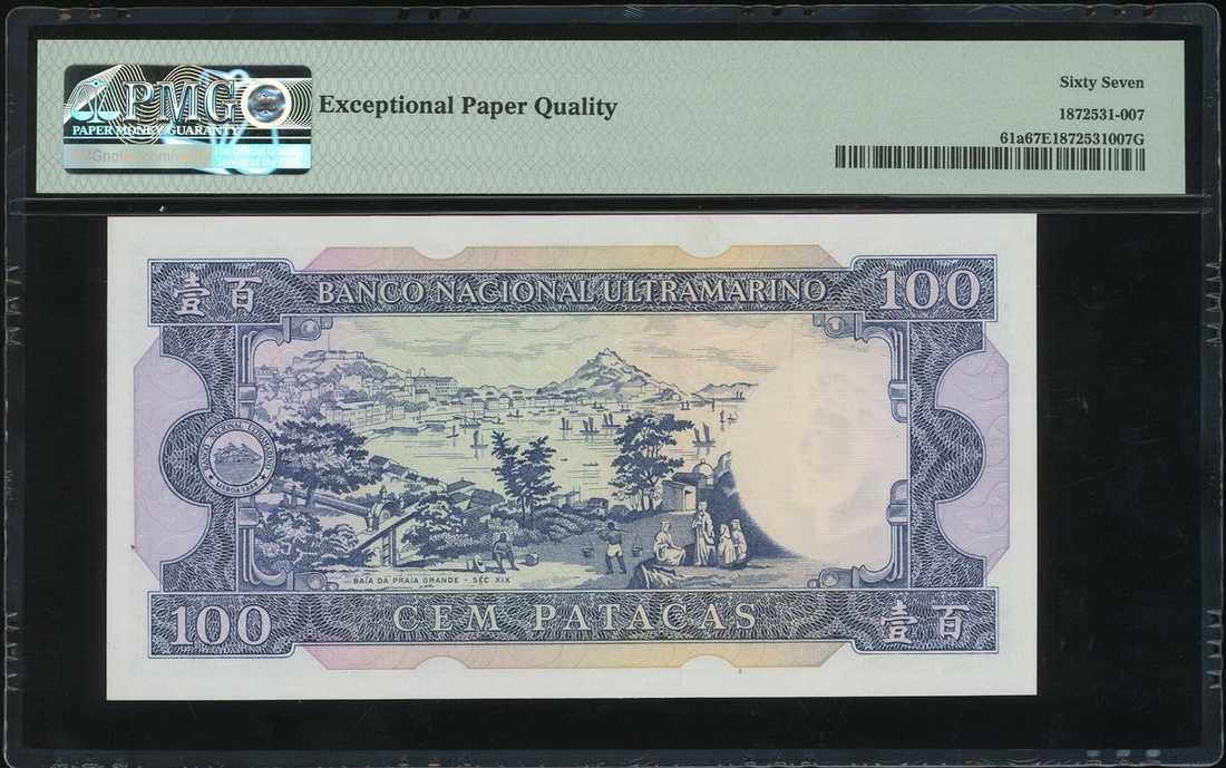 (x) Macau: Banco Nacional Ultramarino, 100 patacas, 12.5.1984, solid serial number NT22222, wtih Presidente,