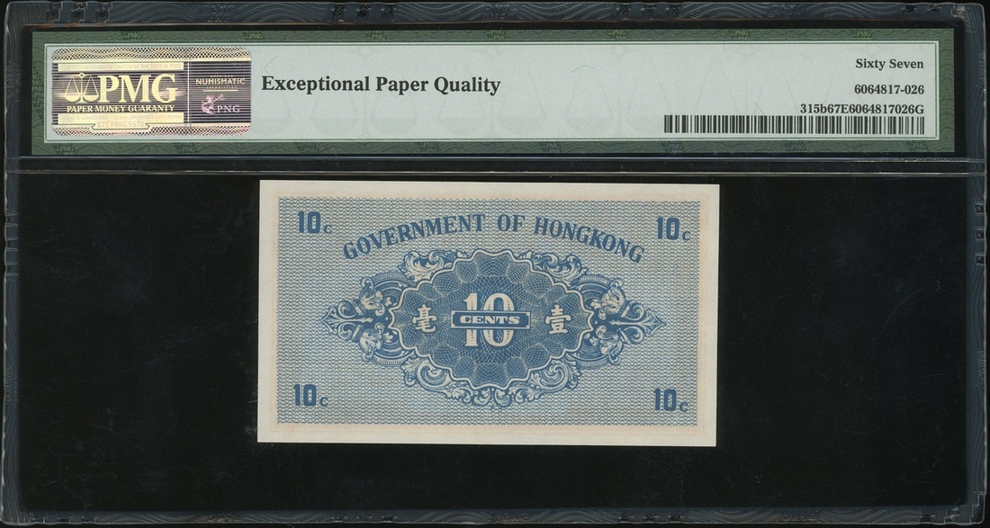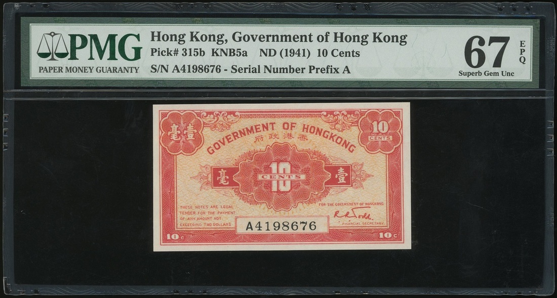 (x) Government of Hong Kong, 10 cents, 1941, serial number A4198676, (Pick 315b), PMG 67EPQ Superb Gem Uncirculated