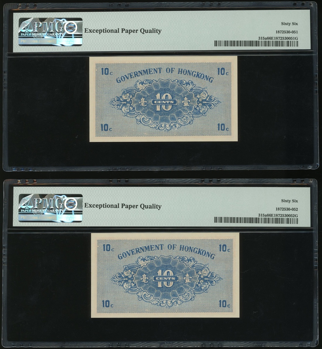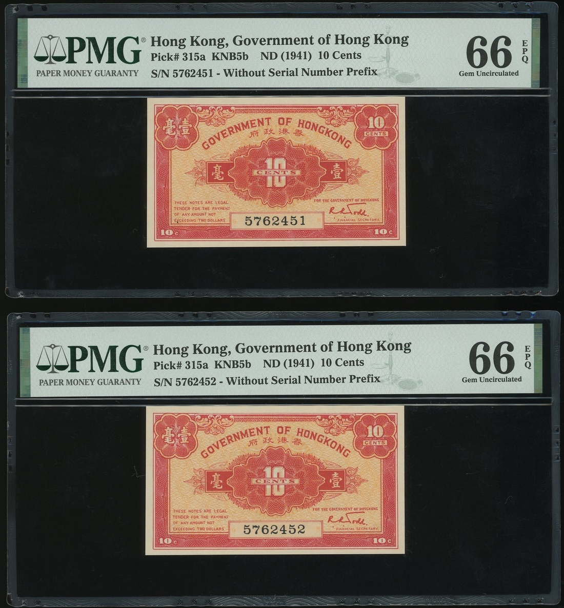 (x) Government of Hong Kong, a consecutive pair of 10 cents, 1941, serial numbers 5762451-452, (Pick 315a), both graded PMG 66EPQ Gem Uncirculated (2)