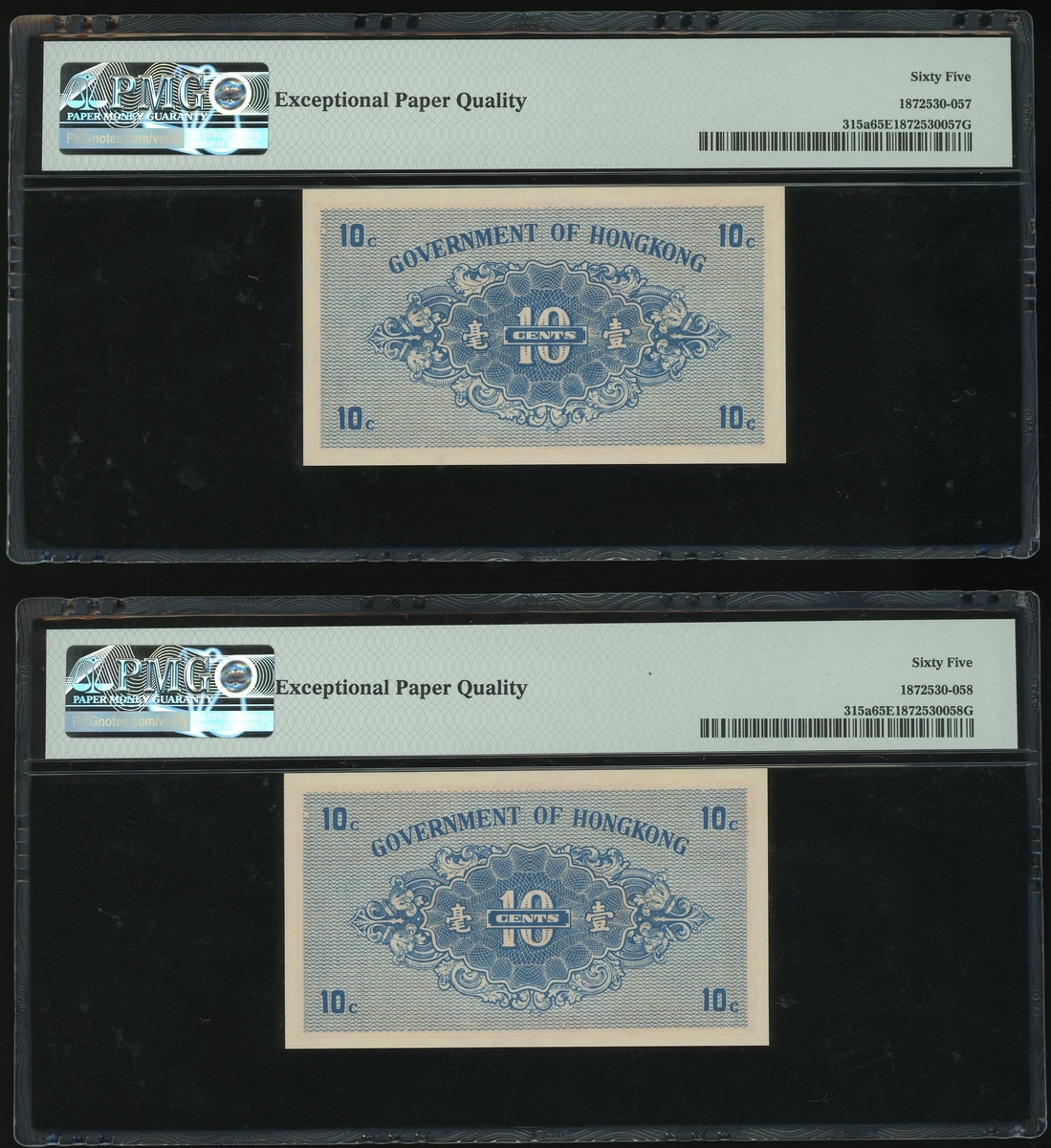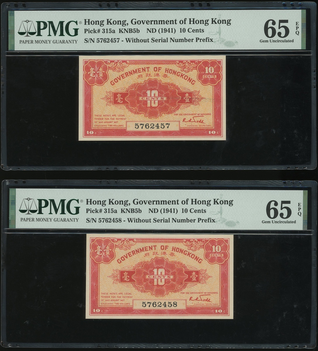 (x) Government of Hong Kong, a consecutive pair of 10 cents, 1941, serial numbers 5762457-458, (Pick 315a), both graded PMG 65EPQ Gem Uncirculated (2)