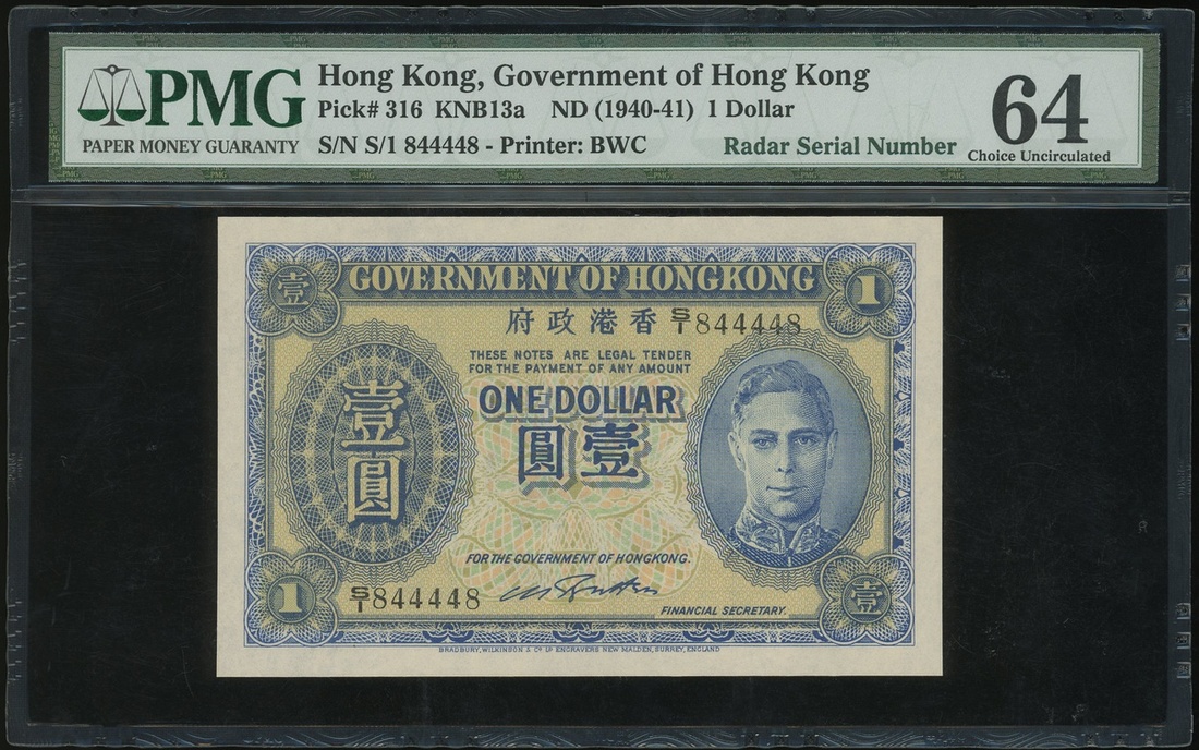 (x) Government of Hong Kong, $1, ND (1940-1941), RADAR serial number S/1 844448, (Pick 316), PMG 64 Choice Uncirculated