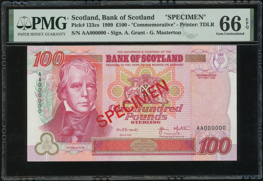 Bank of Scotland, 100 pounds, specimen, 19.5.1999, serial number AA000000, (Pick 123cs), PMG 66EPQ Gem Uncirculated