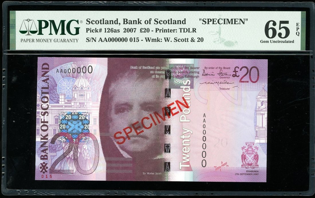 2007年蘇格蘭銀行20鎊樣票,編號AA000000,PMG 65EPQ