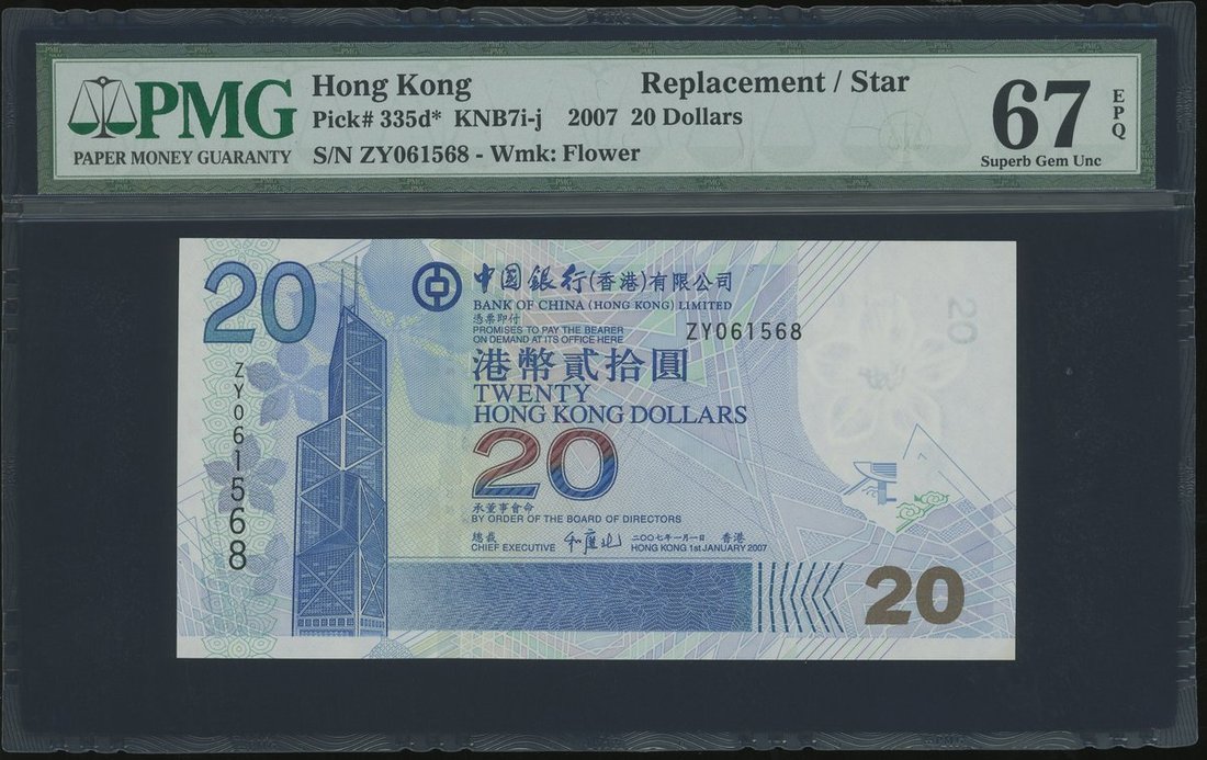 Bank of China, $20, 1.1.2007, replacement serial ZY061568, (Pick 335d*), PMG 67EPQ Superb Gem Uncirculated, minor spot at lower right corner