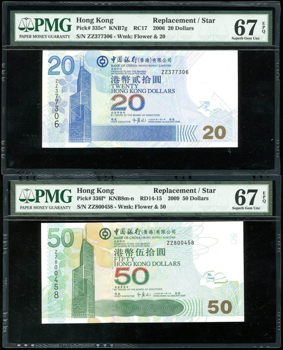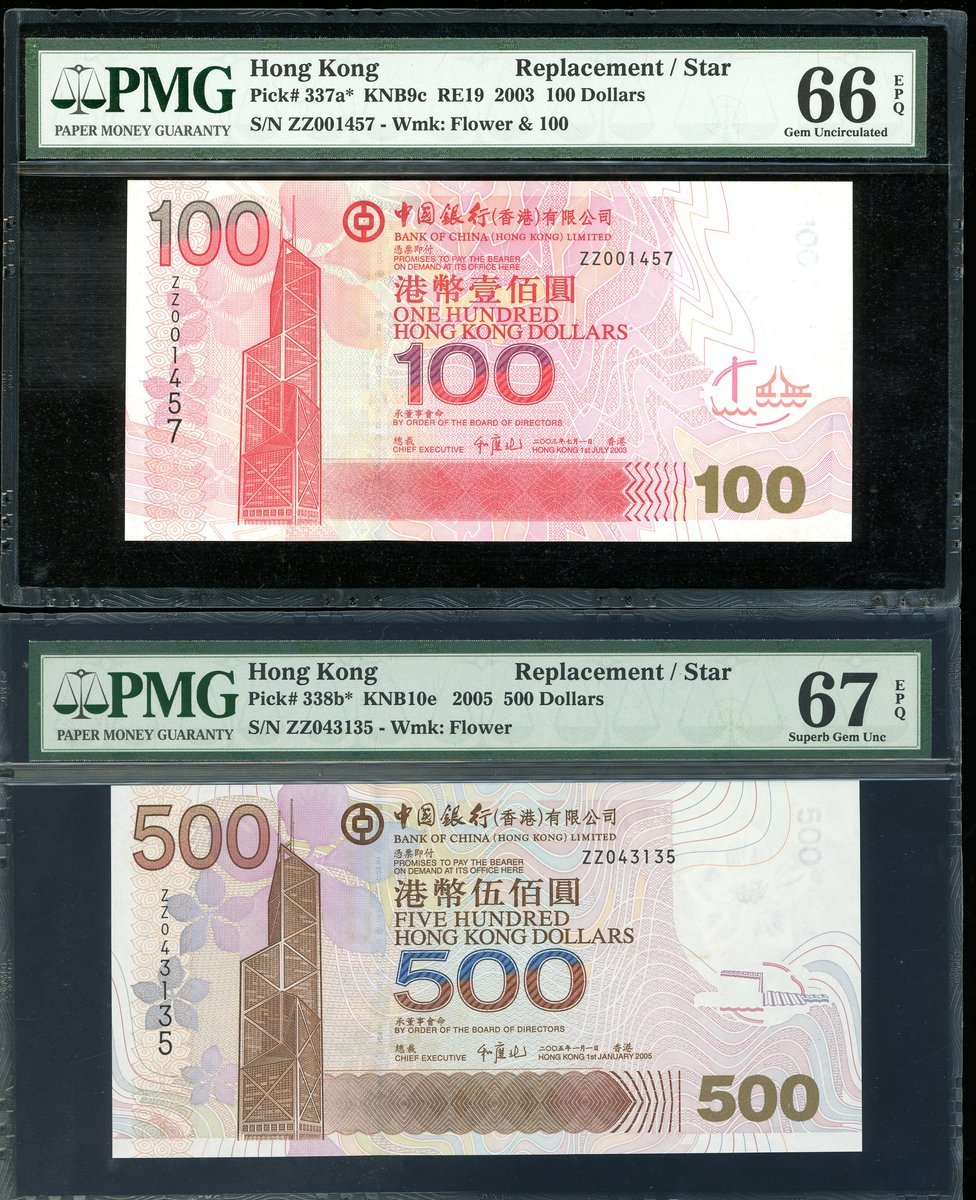 2003-2009年中國銀行補版一組5枚,20、50、100、500及1000元,均ZZ字軌,分別評PMG 67EPQ、67EPQ、66EPQ、67EPQ及66EPQ