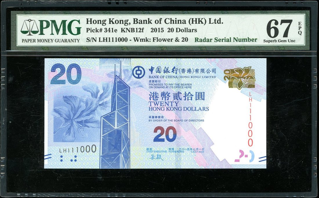 Bank of China, $20, 1.7.2015, fancy serial number LH111000 (Pick 341e), PMG 67EPQ Superb Gem Uncirculated
