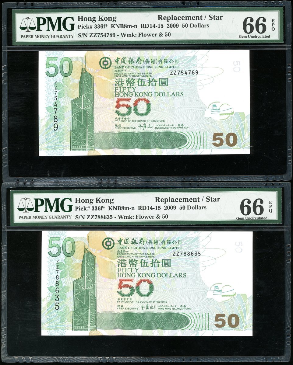 Bank of China, 2x $50, 1.1.2009, replacement serials ZZ754789 and ZZ788635, (Pick 336f*), both graded PMG 66EPQ Gem Uncirculated (2)