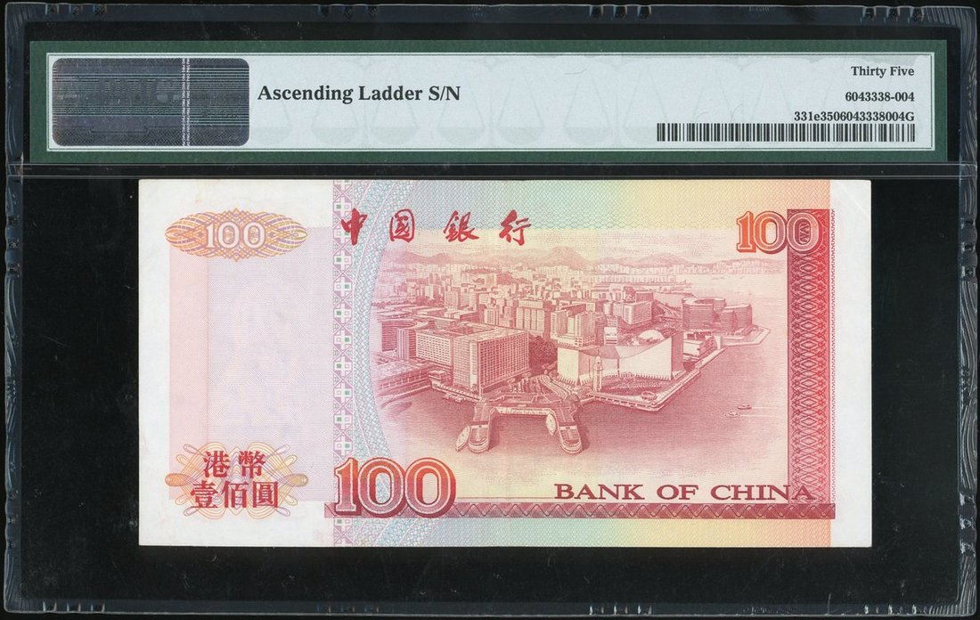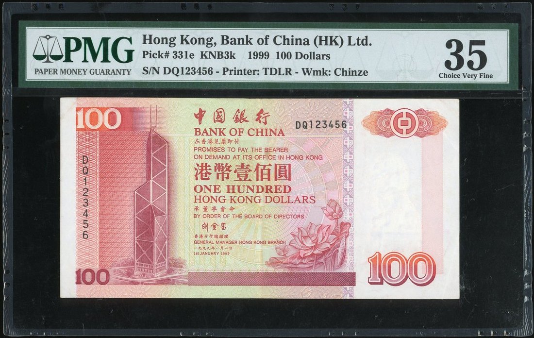 Bank of China, $100, 1.1.1999, ascending ladder serial number DQ123456, (Pick 331e), PMG 35 Choice Very Fine. Lucky serial numbers are rarely seen for this series