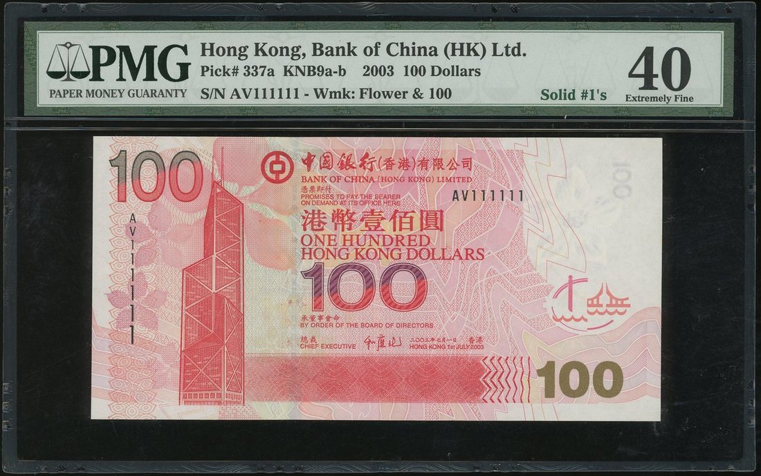 Bank of China, $100, 1.7.2003, solid serial number AV111111, (Pick 337a), PMG 40 Extremely Fine