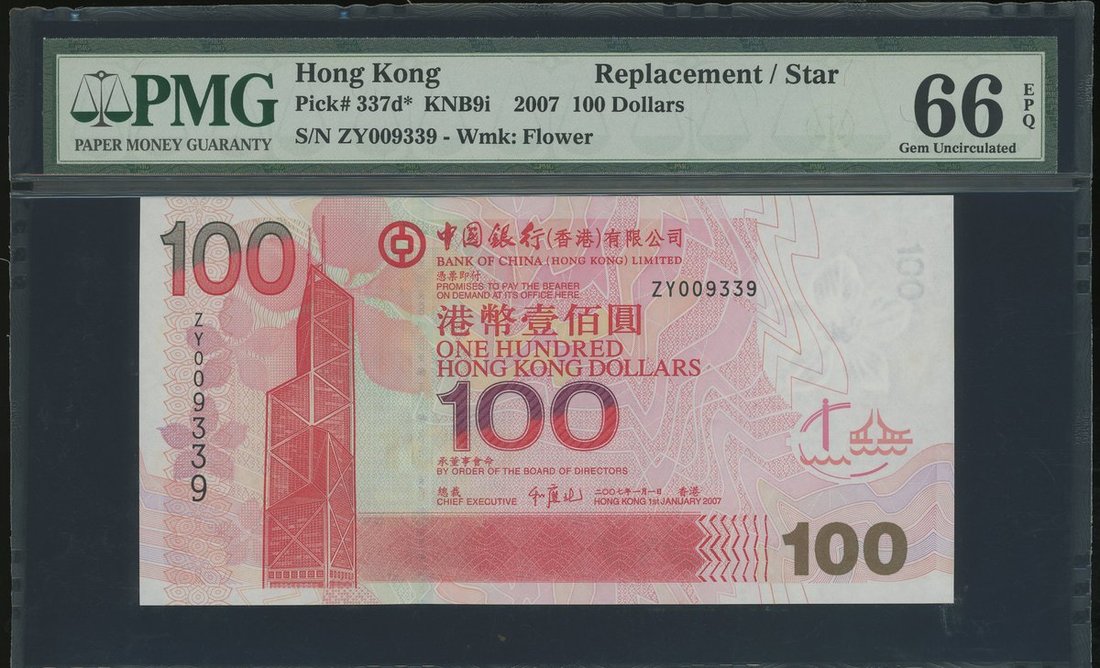 Bank of China, $100, 1.1.2007, fancy replacement serial ZY009339, (Pick 337d*), PMG 66EPQ Gem Uncirculated