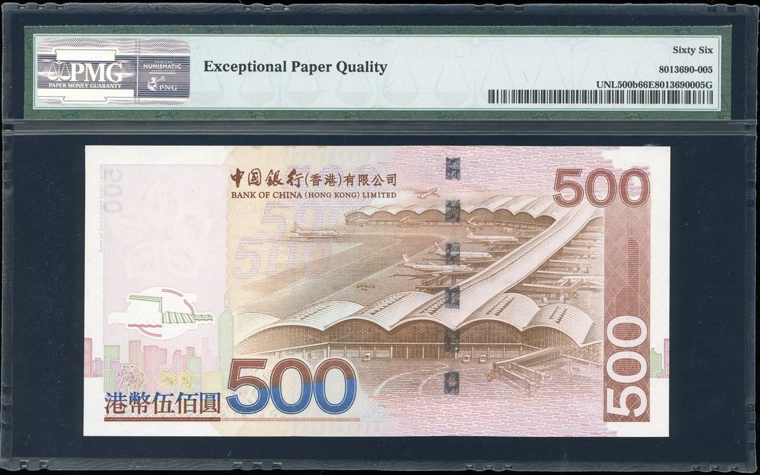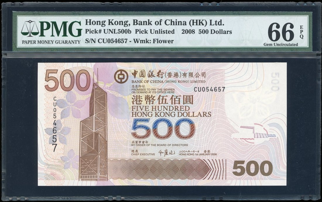 Bank of China, $500, 1.1.2008, serial number CU054657, (Pick 338e), PMG 66EPQ Gem Uncirculated, rare 'CU' serial prefix