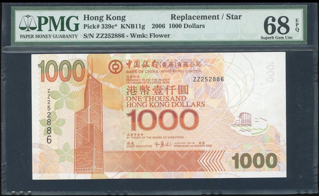 Bank of China, $1000, 2006, replacement, serial number ZZ252886, (Pick 339c*), PMG 68EPQ, rare high grade.