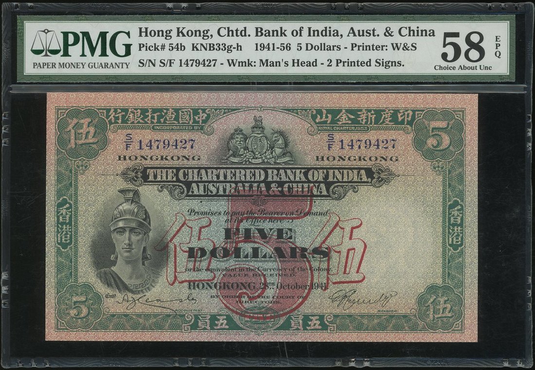 The Chartered Bank of India, Australia and China, $5, 28.10.1941, serial number S/F 1479427, (Pick 54b), PMG 58EPQ Choice About Uncirculated, consecutive to the previous lot and fresh
