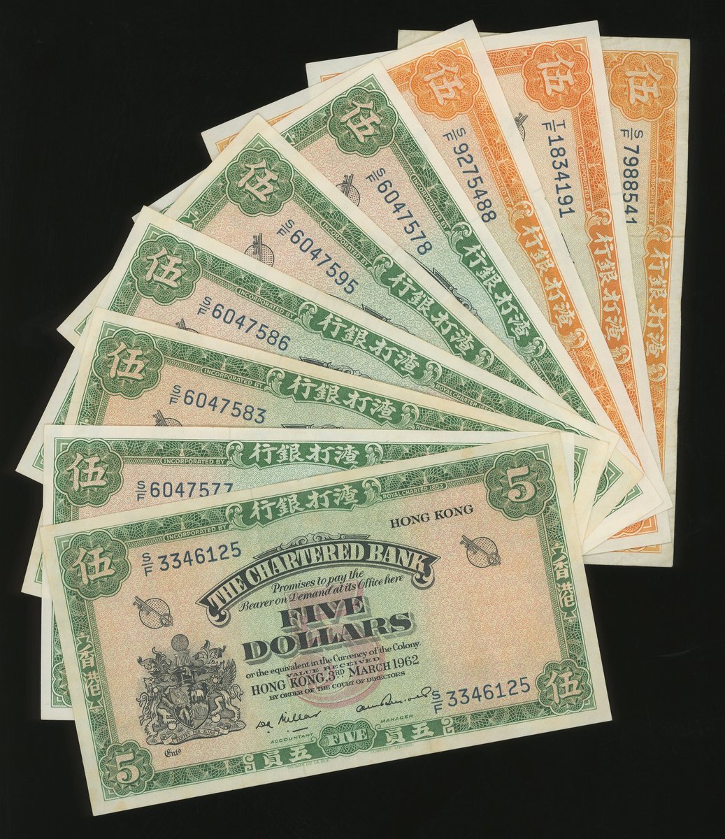 Chartered Bank, group of 19 notes consisting of: $5, 'Green Key' no date (5), 3.3.1962 (1), 'Yellow Key' (3), $50, 'Blue House' (2) and 'Small Lion and Ball' 1996 (6) and 1999 (2),
