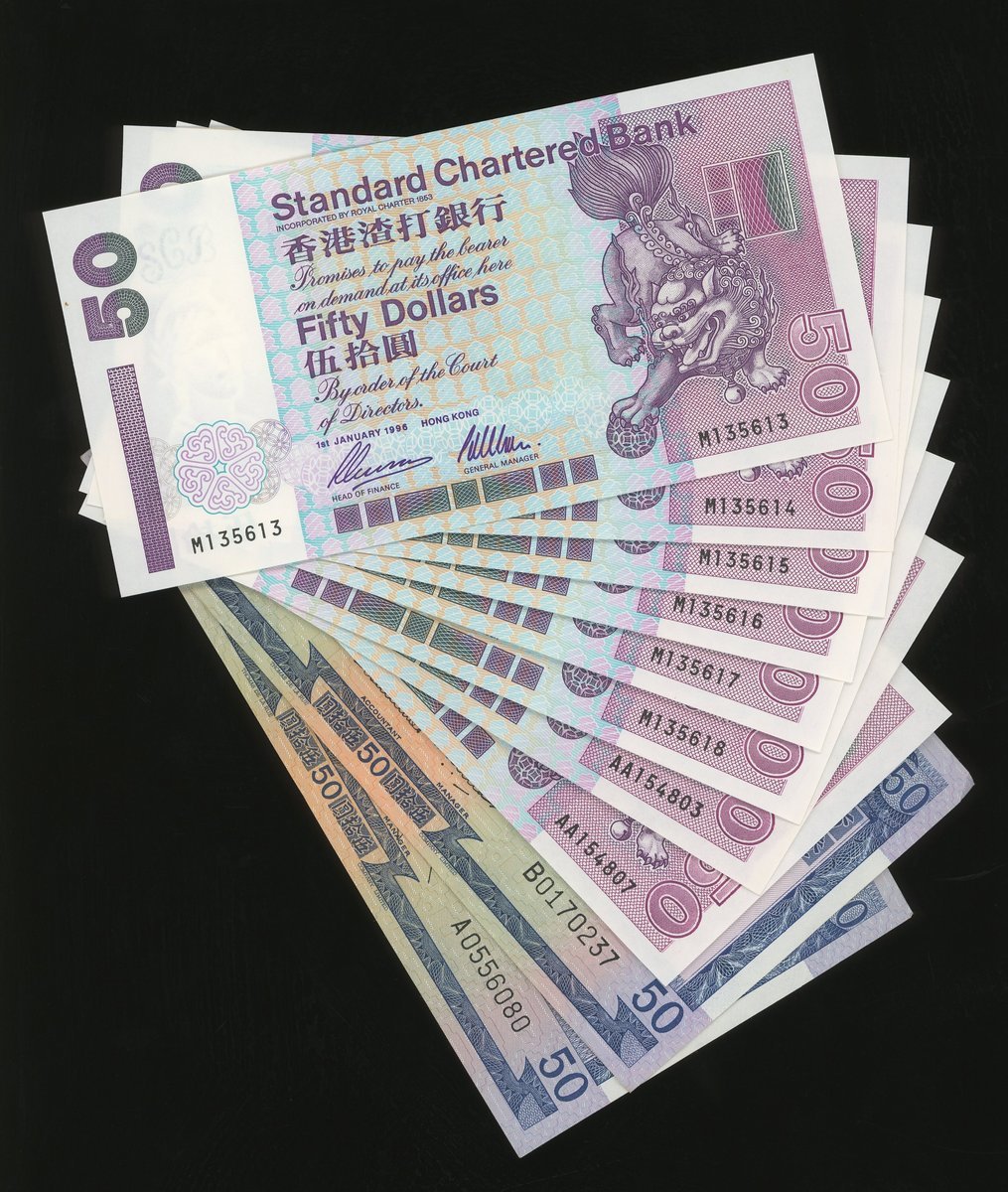 渣打銀行一組19枚,包括「綠鎖匙」5元,無日期5枚,1962年1枚,「黃鎖匙」50元3枚,「藍屋」2枚,「獅子踩波」1996年2枚及1999年2枚,「綠鎖匙」AU品相,中間有折及微黃,「黃鎖匙」及「藍屋」VF至EF,其餘UNC