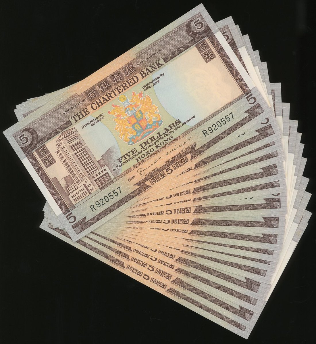 The Chartered Bank, 16x $5, ND (1970-1975), consecutive serial numbers R920541-557, missing 555, (Pick 73a), uncirculated, some minor toning (16)