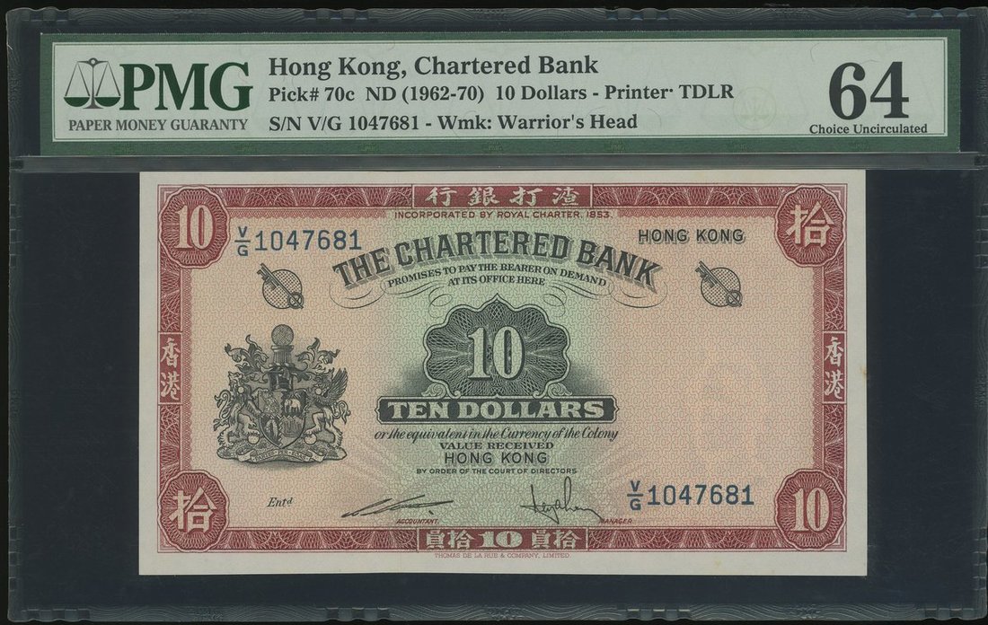 1962-70年渣打銀行10元,無日期,編號V/G 1047681,PMG 64