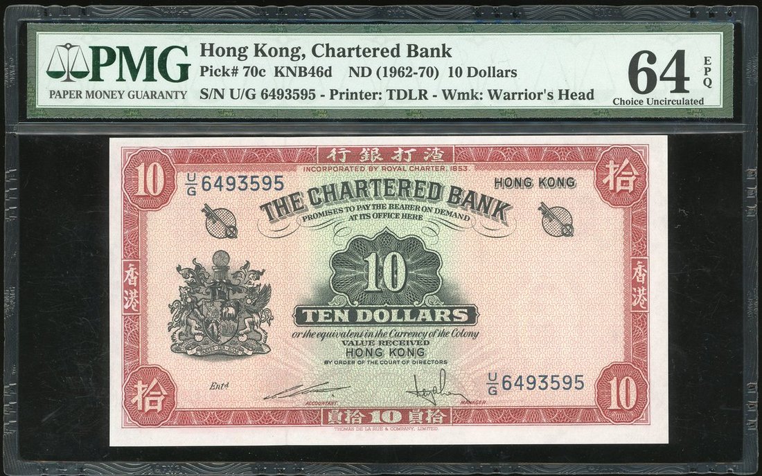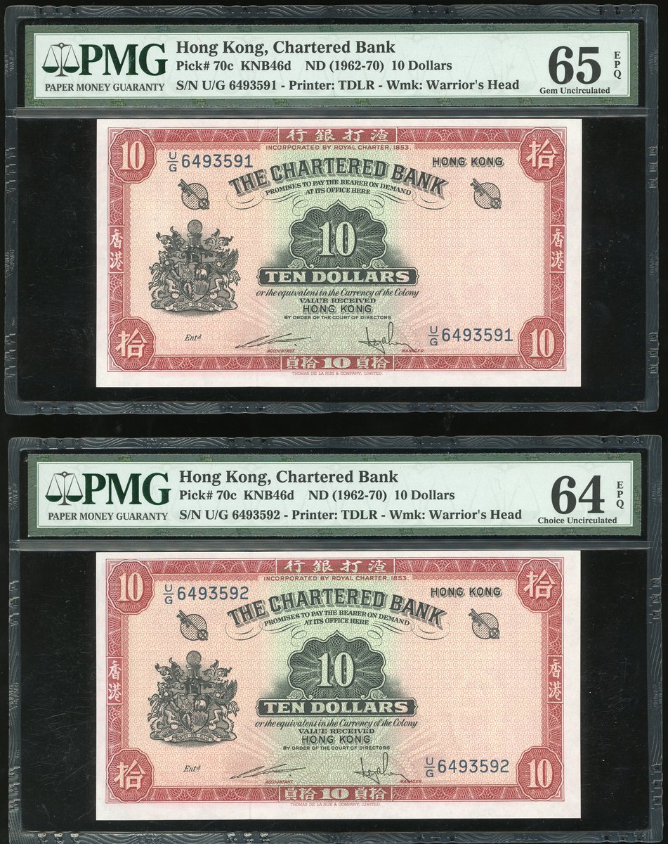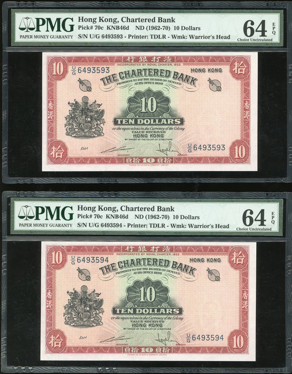 1962-70渣打銀行10元(紅鎖匙)5枚連號一組,編號U/G 6493591-595,除第一枚獲PMG65EPQ 外,其他均評64EPQ