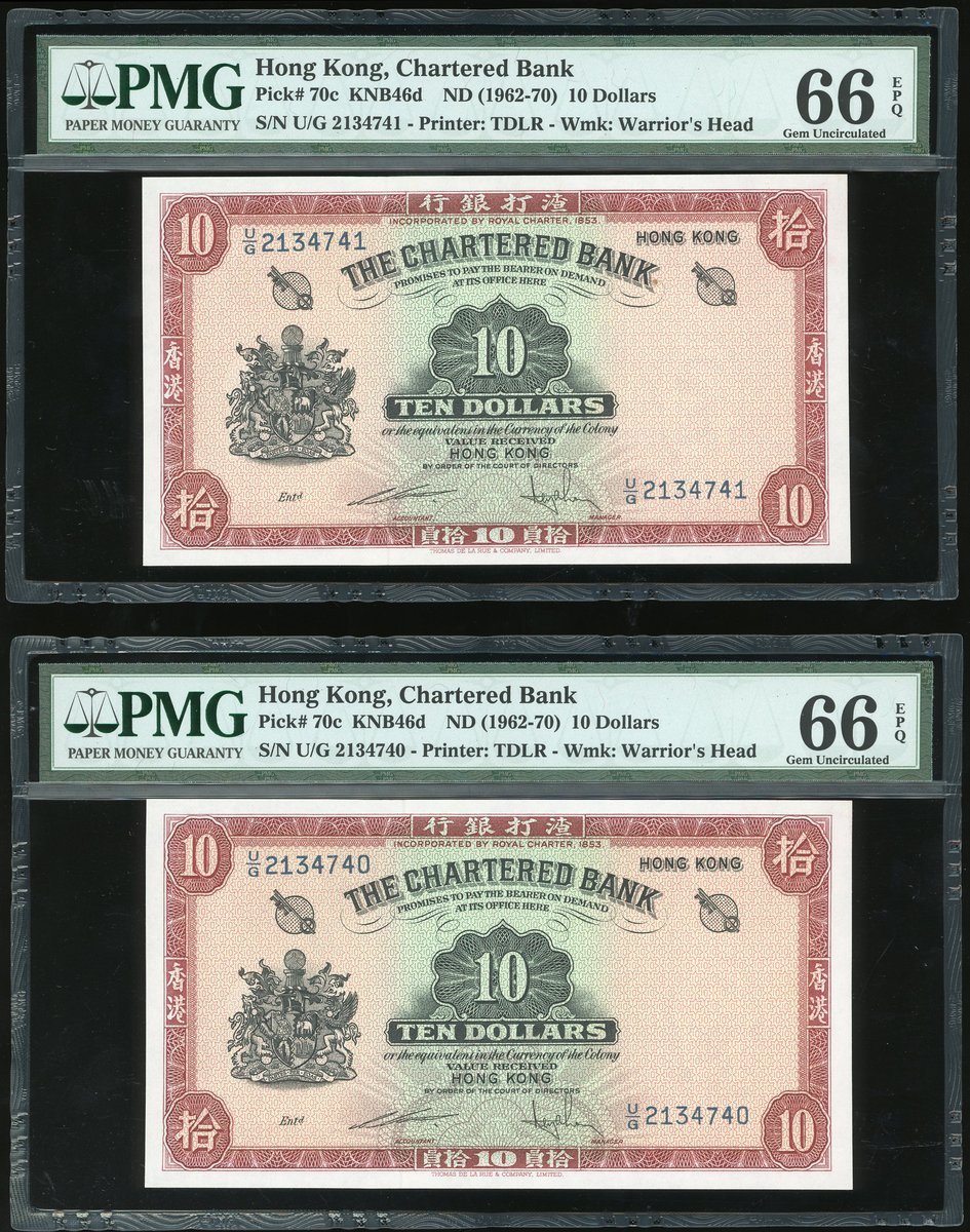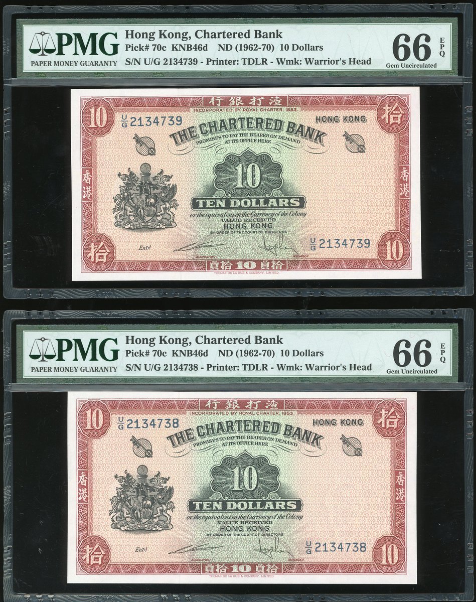 1962-70渣打銀行10元(紅鎖匙)4枚連號一組,編號U/G 2134738-741,均評PMG66EPQ
