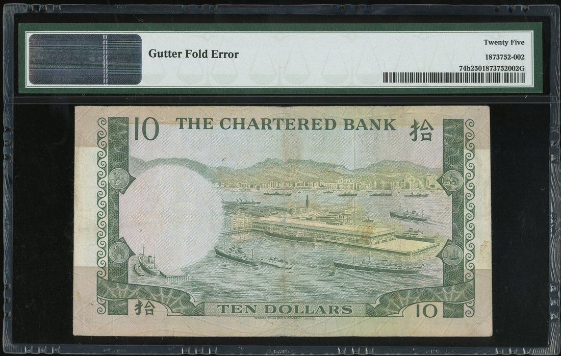 1975年渣打銀行10元右邊摺白錯體但只限於面層印刷,編號C8630215,PMG 25,罕見錯體