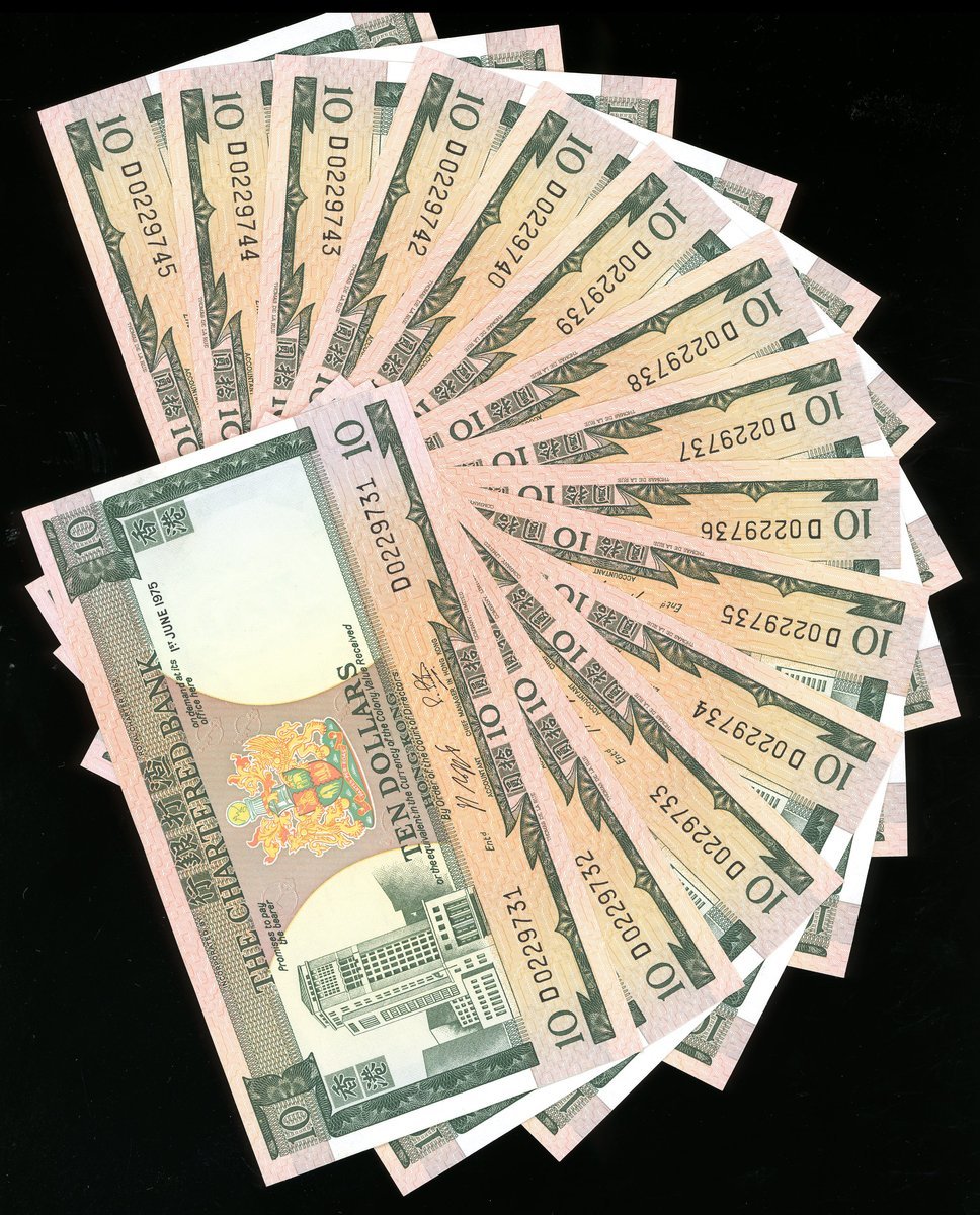 1975年渣打銀行10元(綠屋)14枚連號一組,編號D0229731-45,缺741號,AU品相,此系列10元的重要年份