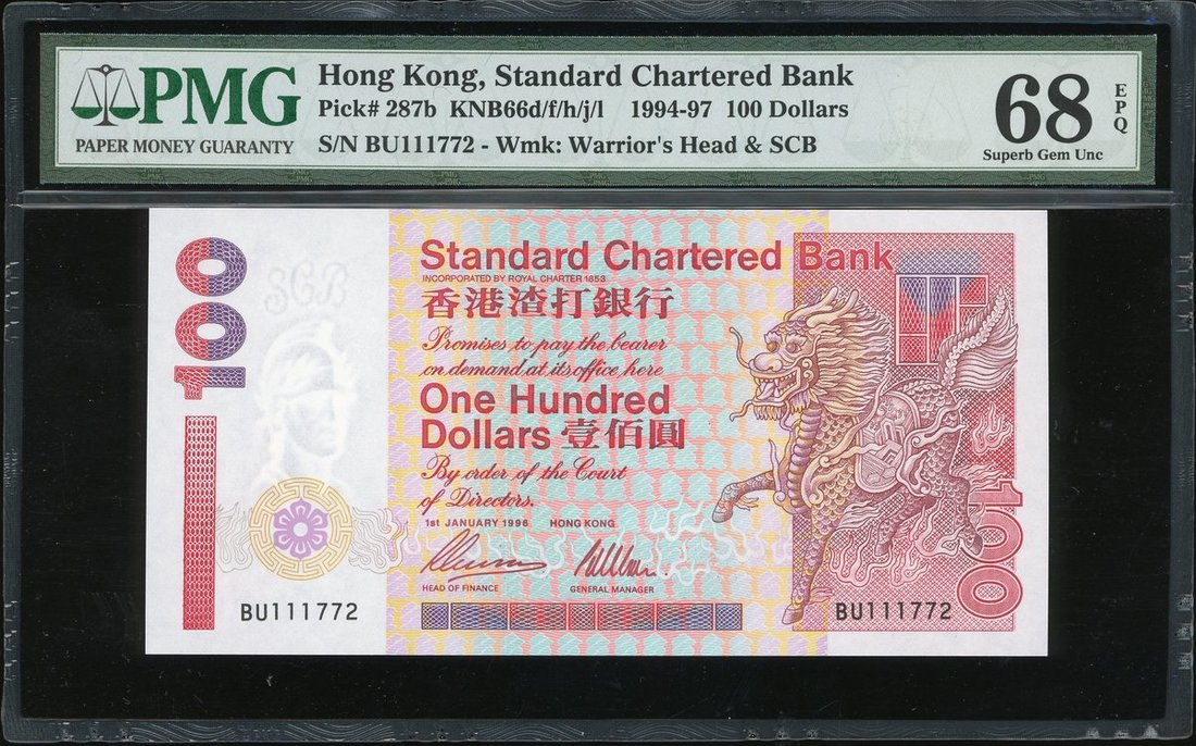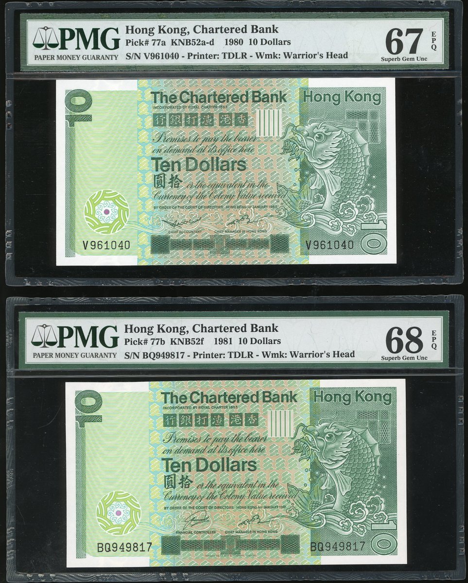 渣打銀行紙幣3枚一組,包括1980及1981年10元,以及1996年100元,分別評PMG 67EPQ,68EPQ及68EPQ