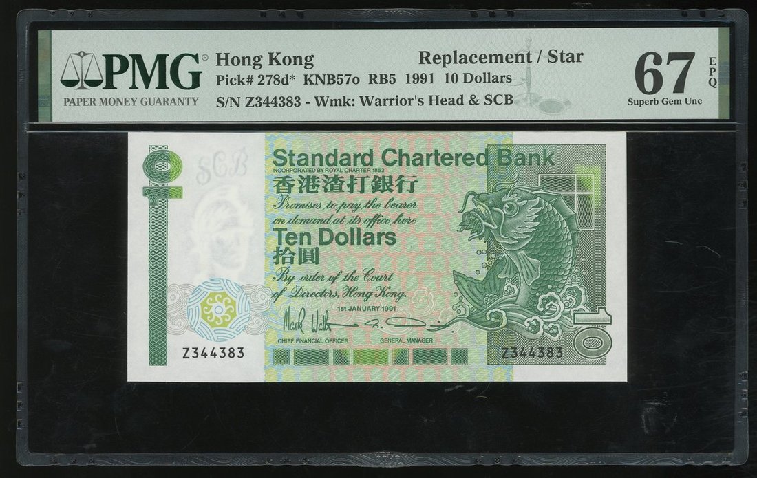 1991年渣打銀行10元,補版編號Z344383,PMG 67EPQ