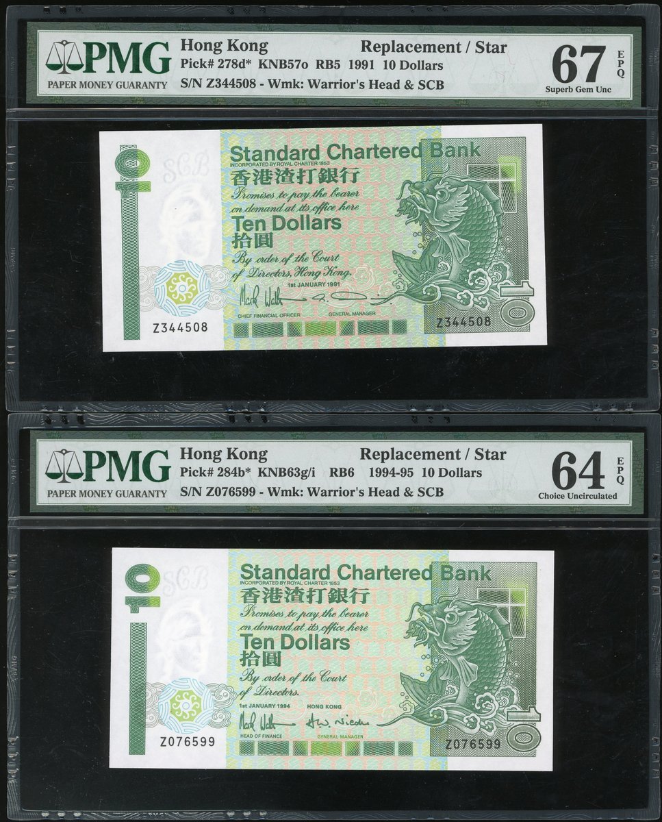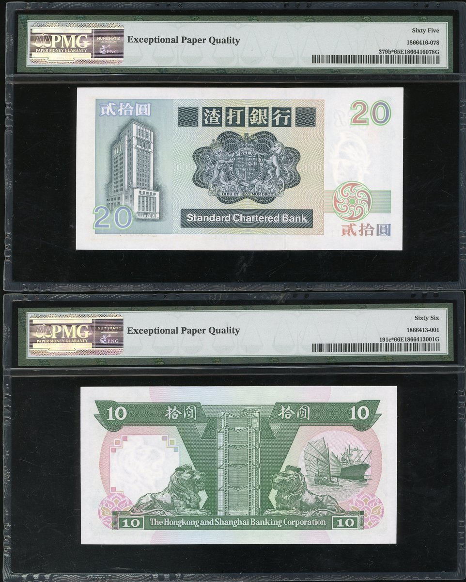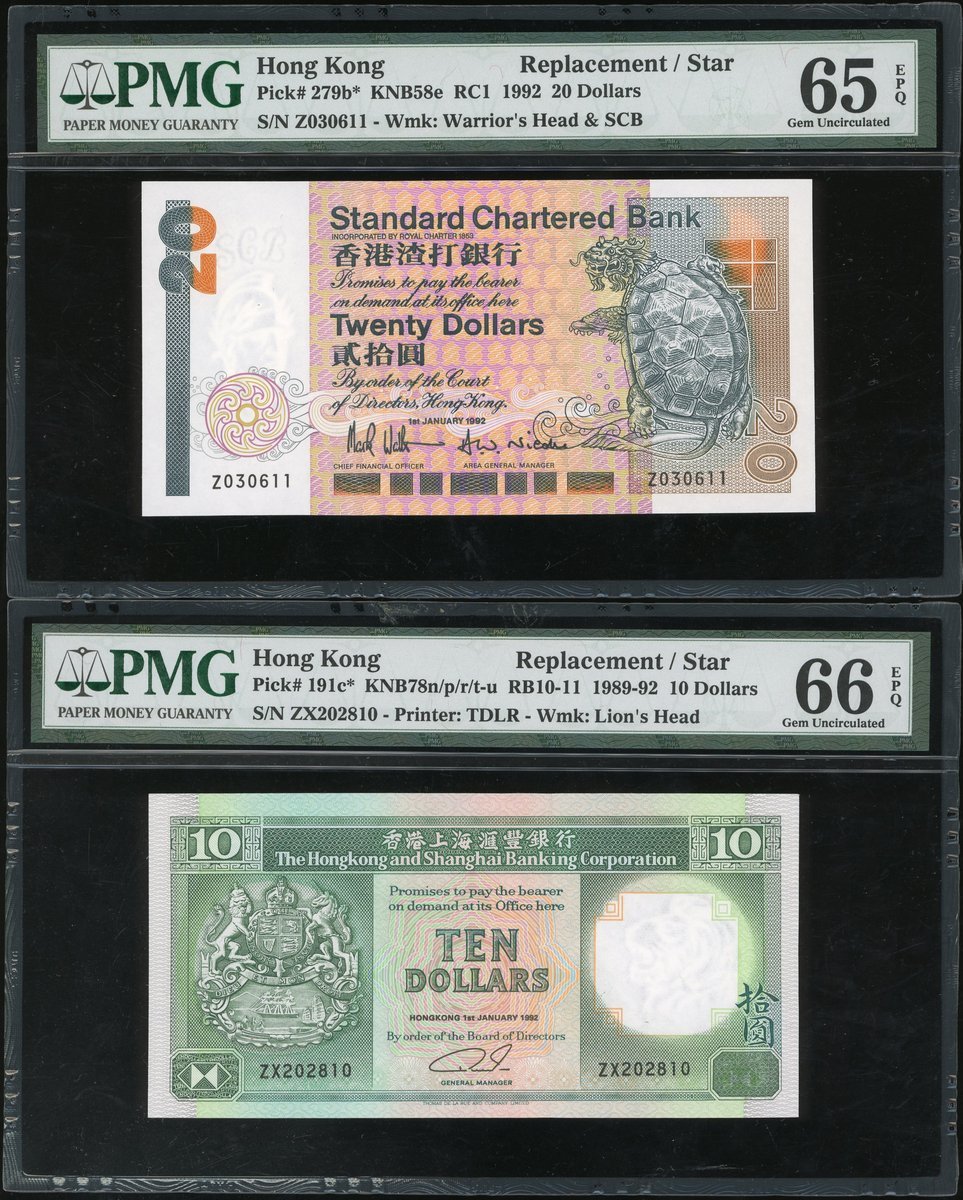 香港補版一組4枚,包括渣打銀行1991及1994年10元、1992年20元及1992年匯豐銀行10元,編號Z344508、Z076599、Z030611及 ZX202810,分別評PMG 67EPQ、64EPQ、65EPQ及66EPQ