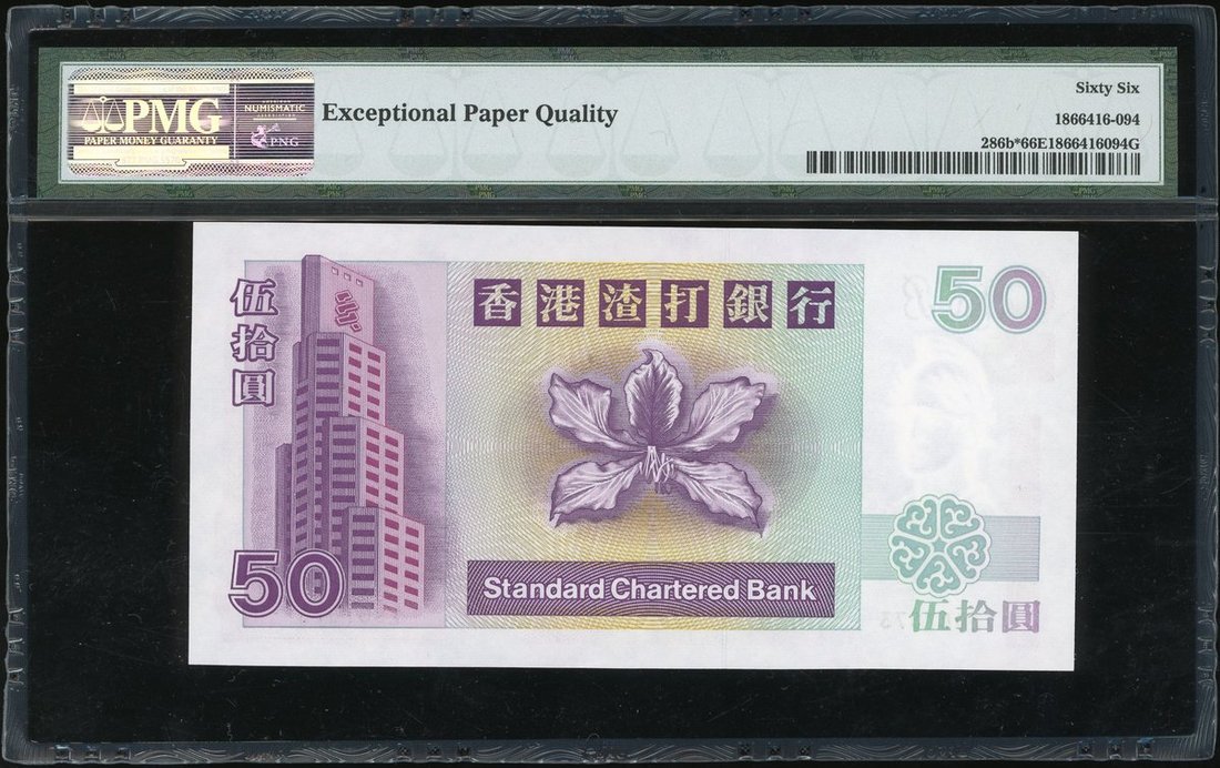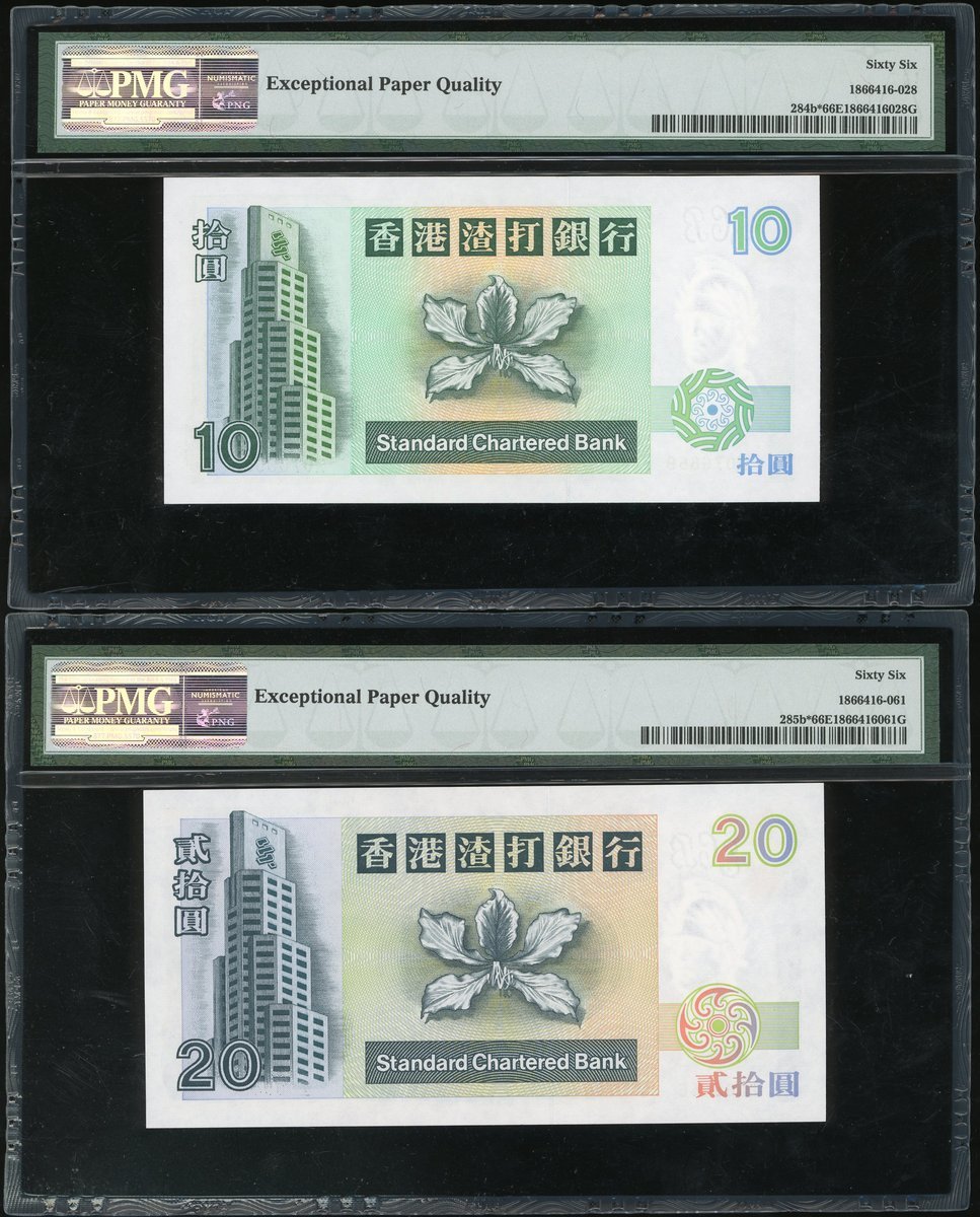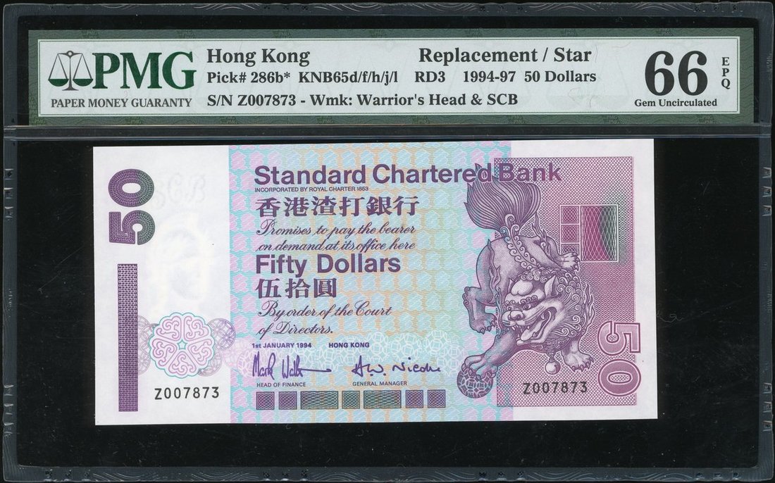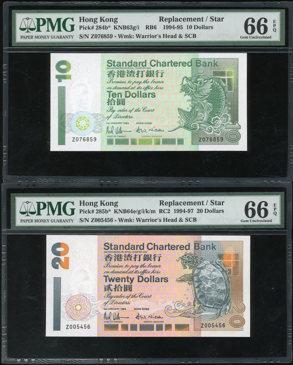 1994年渣打銀行10、20及50元,補號Z076859、Z005456及Z007873,均PMG 66EPQ