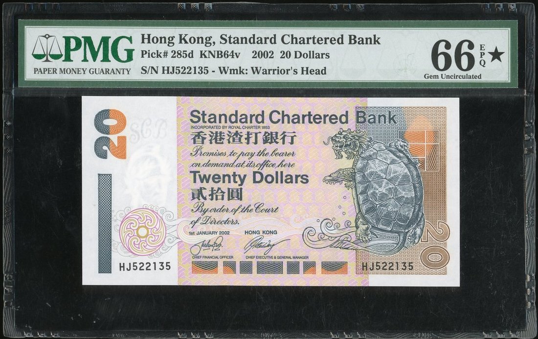 2002年渣打銀行20元,編號HJ522135,PMG 66EPQ*