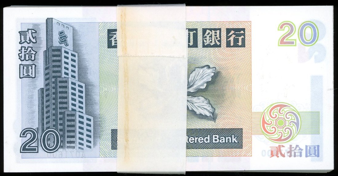 1997年渣打銀行20元連號100枚,A071501至600,除尾枚有輕微碰折外,其餘均UNC