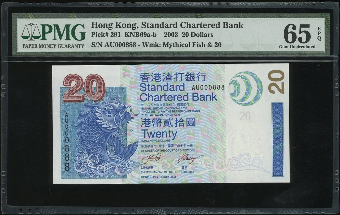 2003年渣打銀行20元,趣味細號AU000888,PMG65EPQ