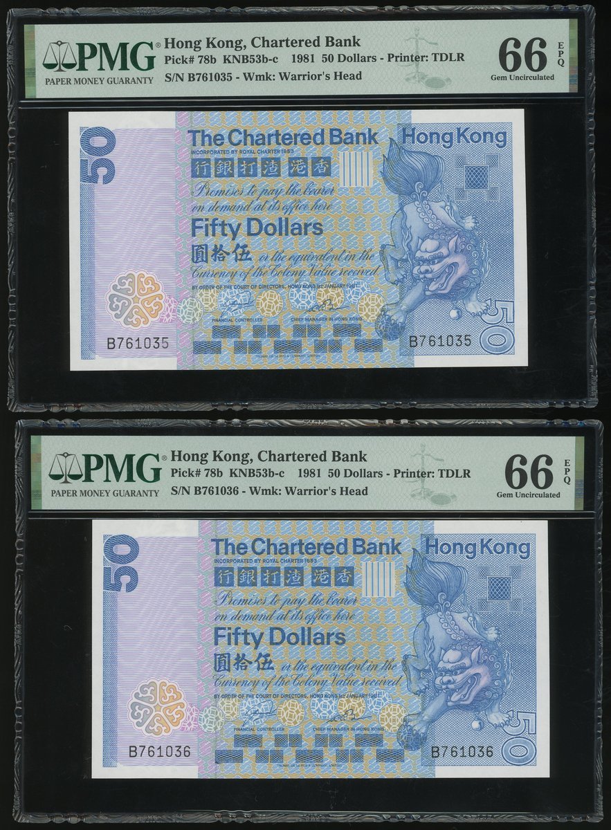 1981年渣打銀行50元(獅子踩波)連號2枚,編號B761035-036,均評PMG66EPQ