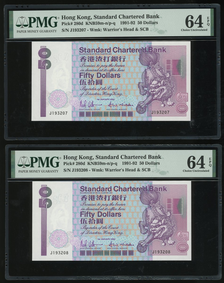 Standard Chartered Bank, $50, 1.1.1992, consecutive serial numbers J193207-208, (Pick 280d), both PMG 64EPQ Choice Uncirculated. The last prefix for the 'Long Bar' variety and only 200,000 notes issued for the 'J' prefix. A modern scarcity (2)