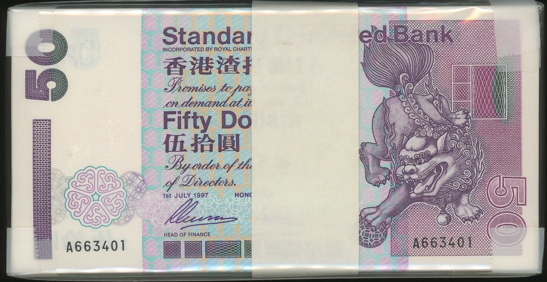 1997年渣打銀行50元100枚連號,編號A663401-500,UNC品相,罕見連銀行原包裝