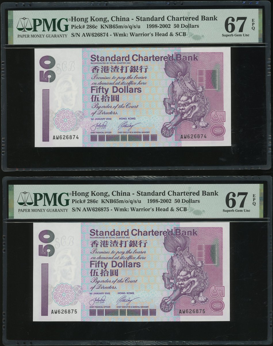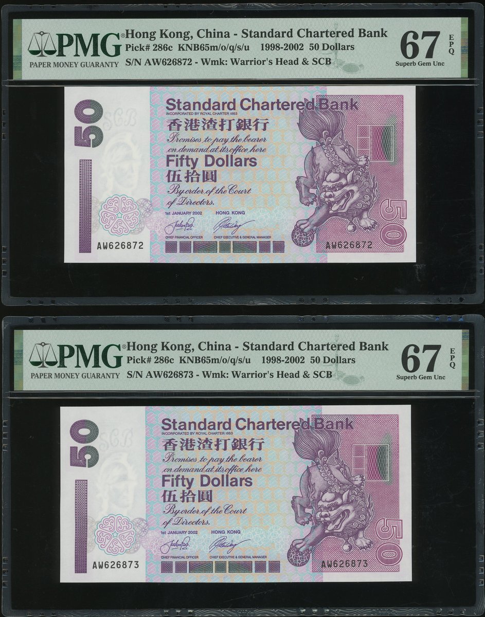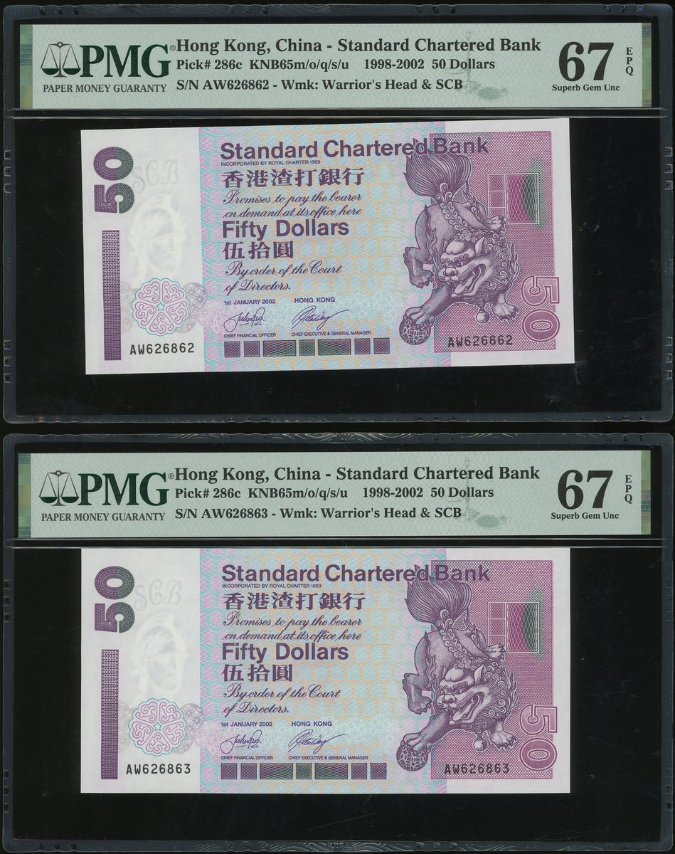 2002年渣打銀行50元連號15枚一組,編號AW626862-76,評PMG66EPQ -67EPQ, AW為此系列最後的字軌