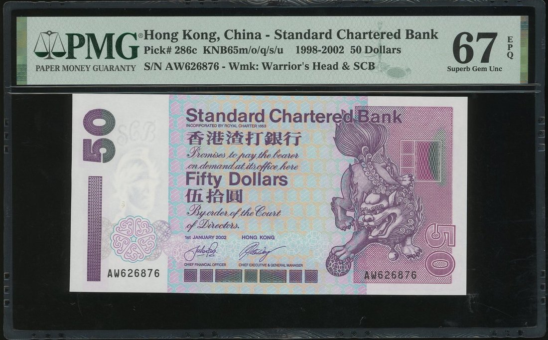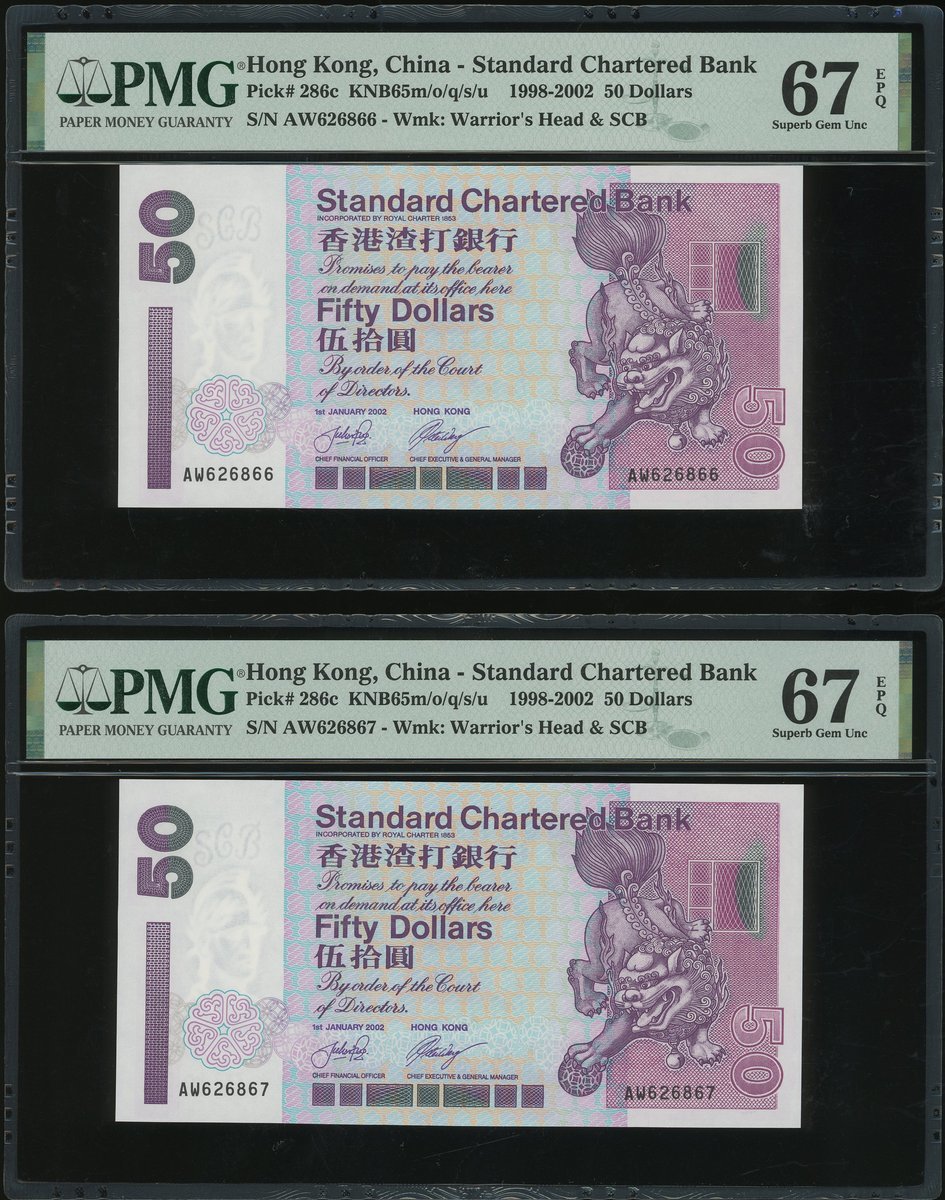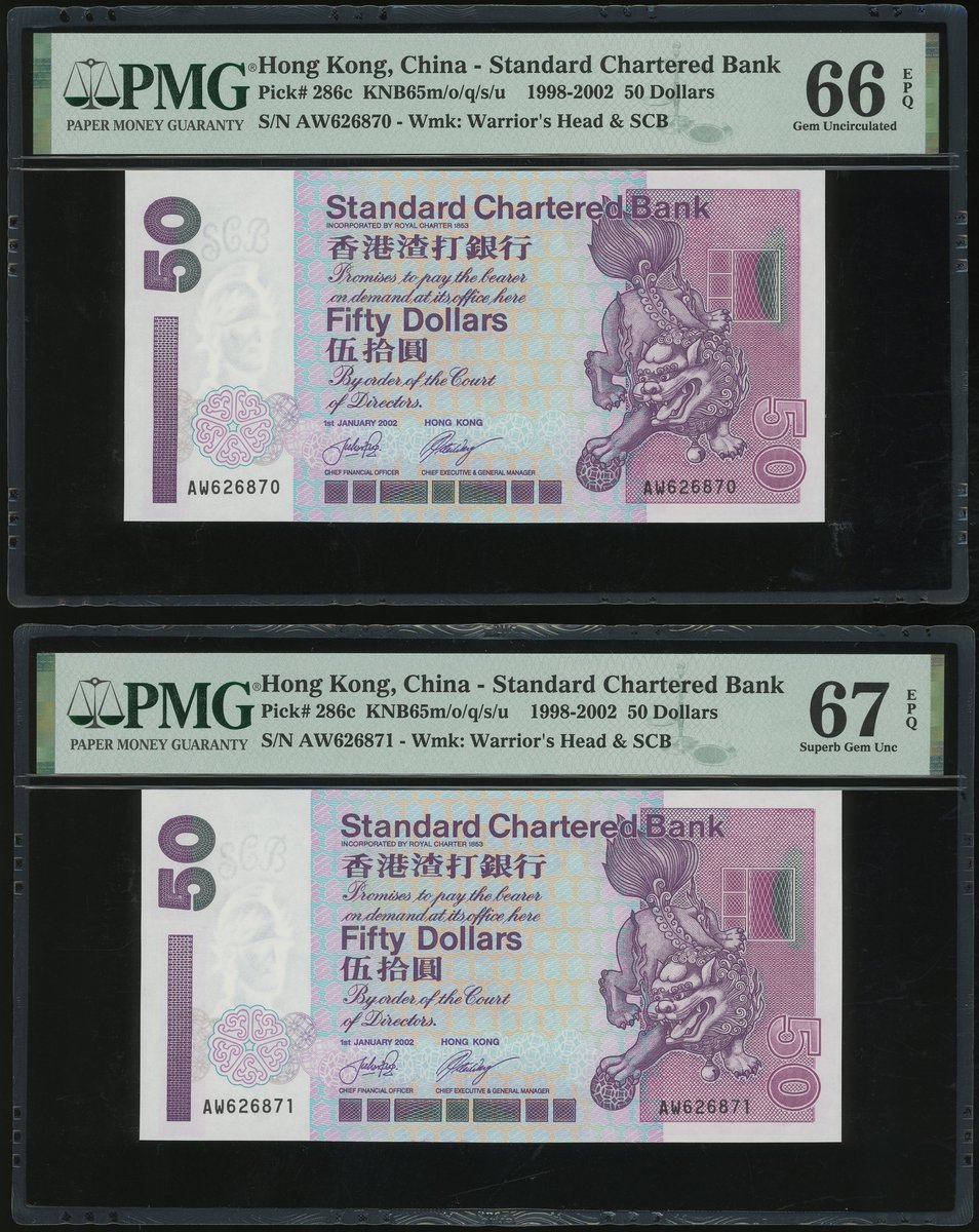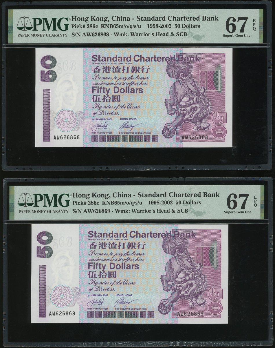 2002年渣打銀行50元連號15枚一組,編號AW626862-76,評PMG66EPQ -67EPQ, AW為此系列最後的字軌