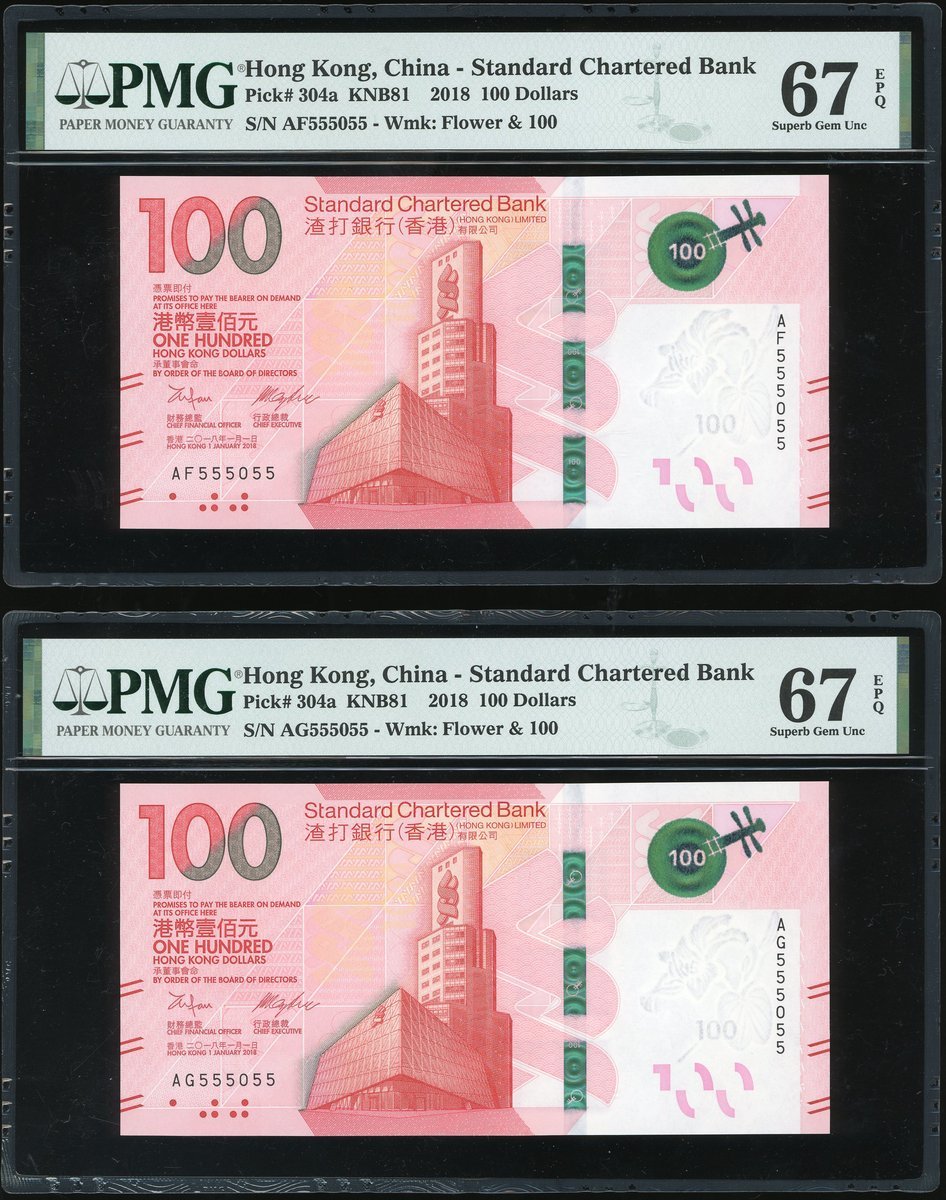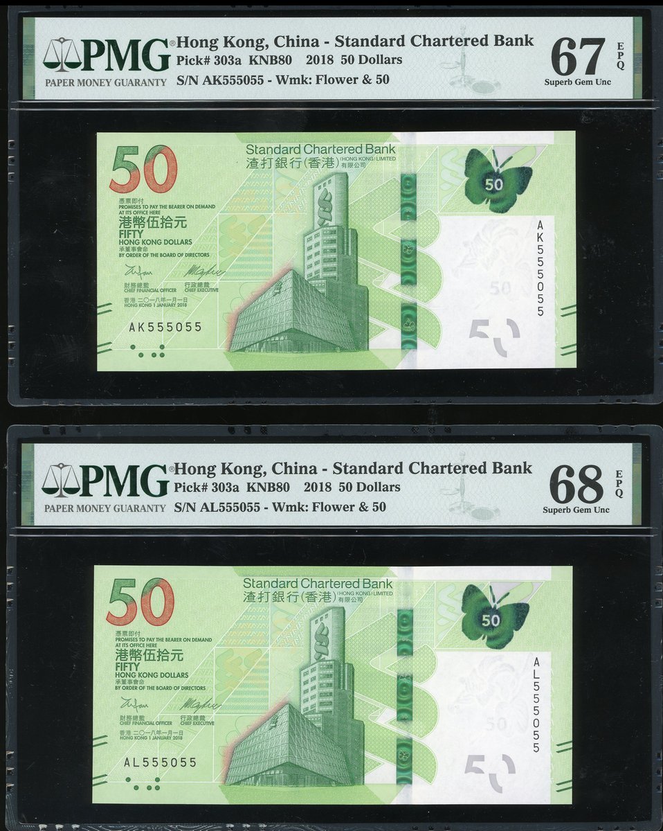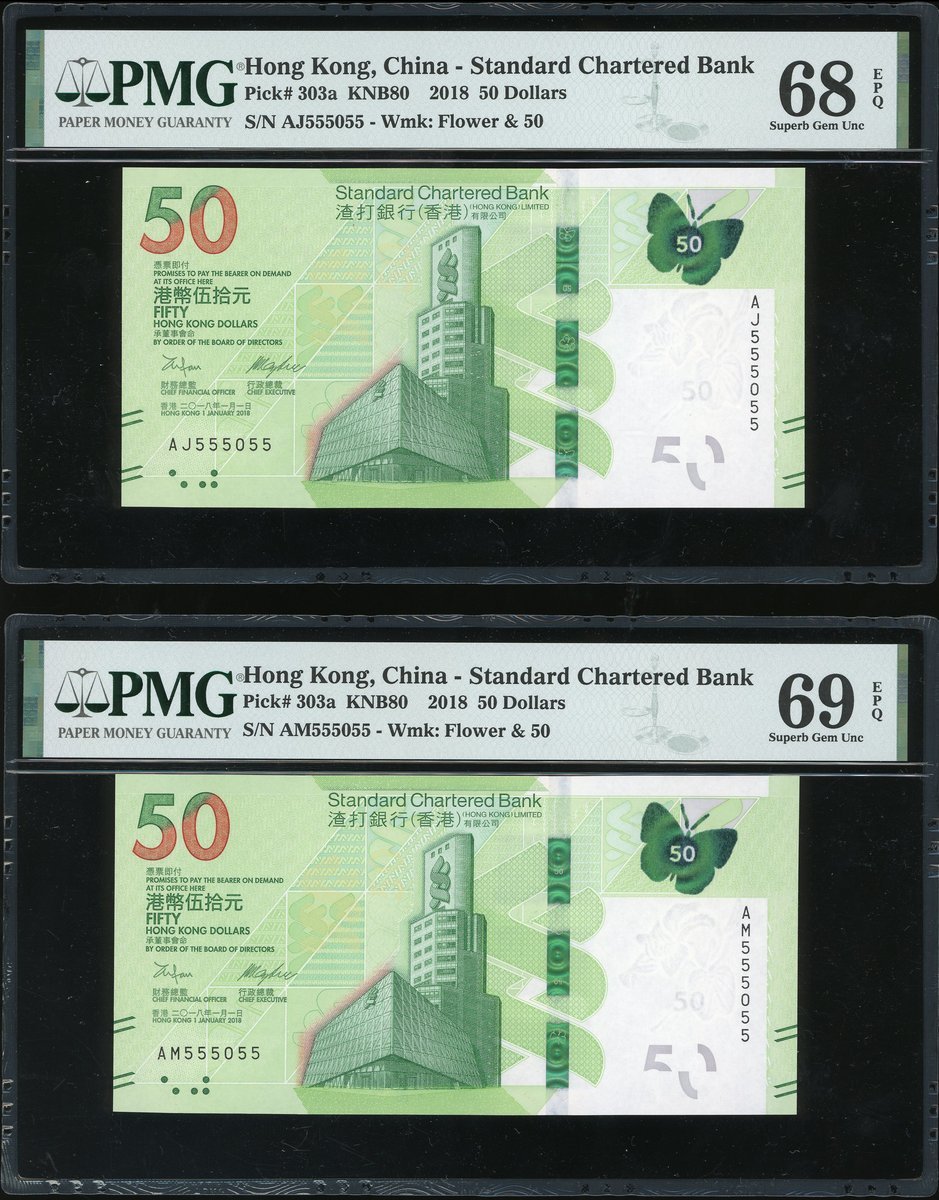 2018年渣打銀行50元4枚及100元7枚,AF至AM字軌,相同編號555055,50元評PMG 67-69EPQ,100元評PMG 67-68EPQ