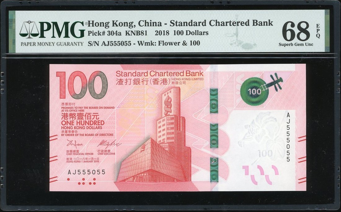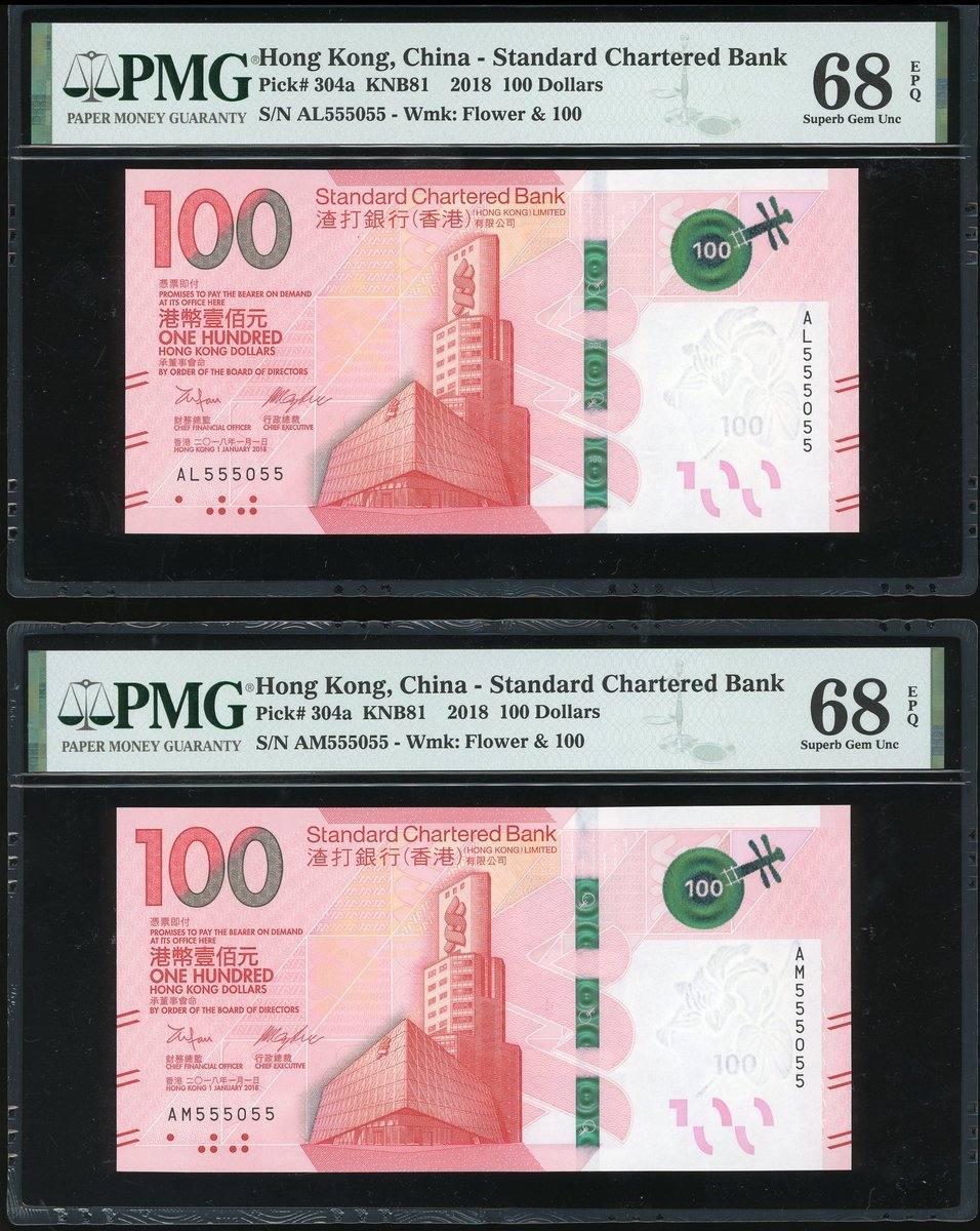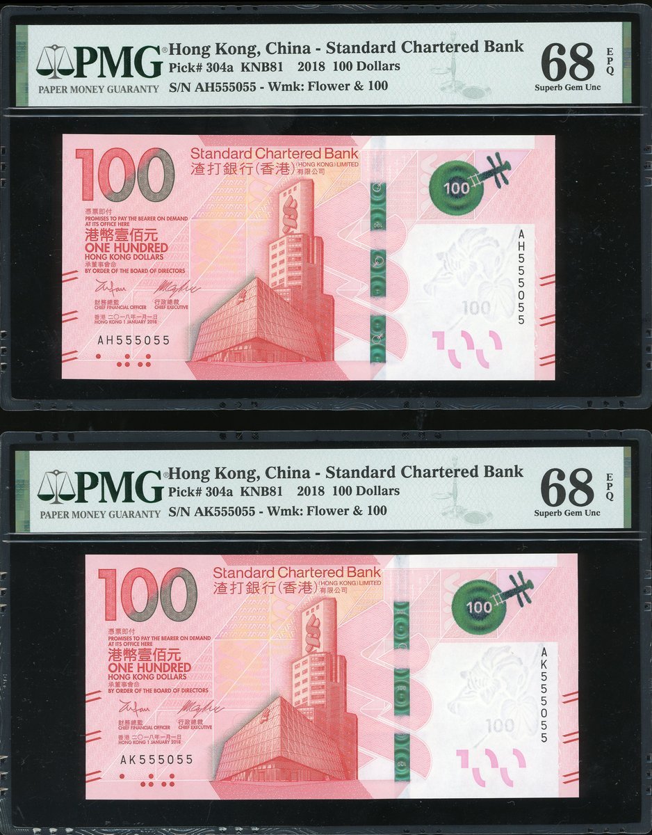 2018年渣打銀行50元4枚及100元7枚,AF至AM字軌,相同編號555055,50元評PMG 67-69EPQ,100元評PMG 67-68EPQ