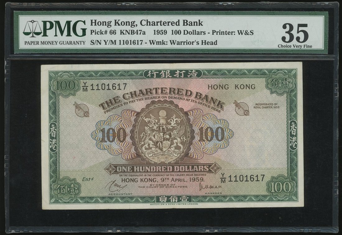 1959年渣打銀行100元,編號 Y/M 1101617,PMG 35(有書寫),原色美品