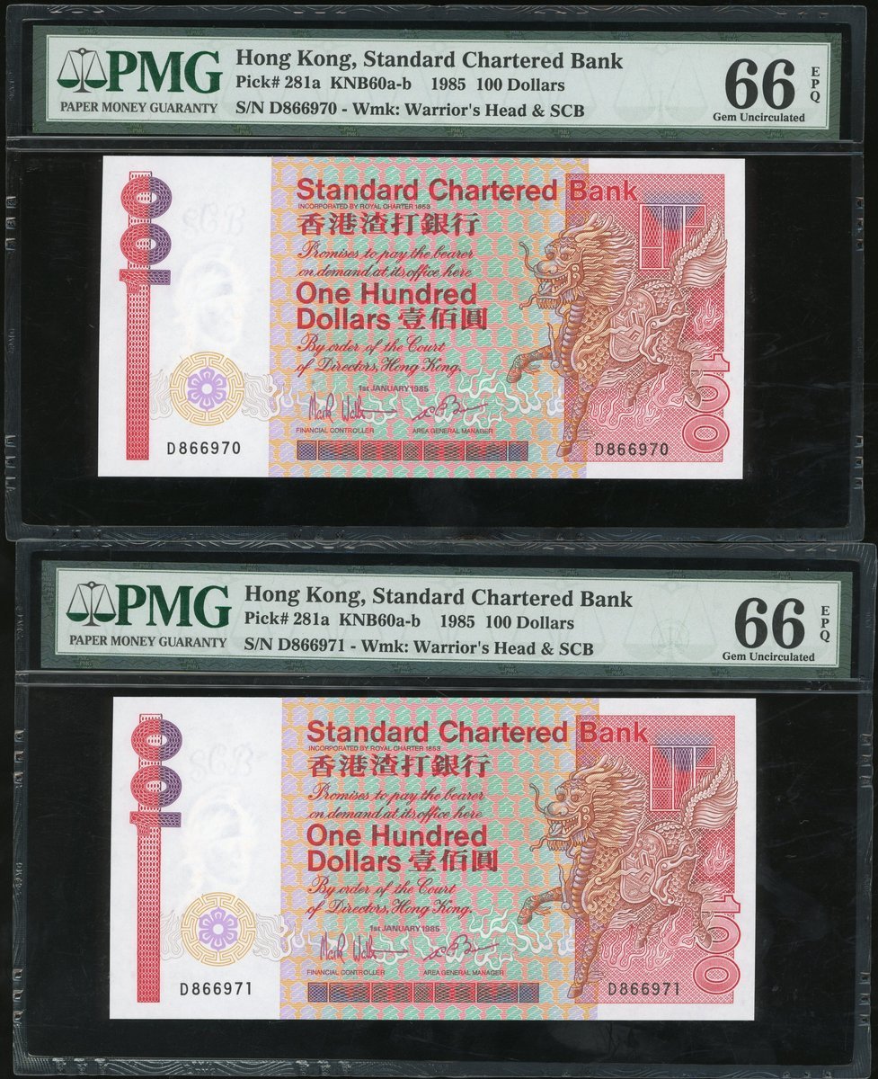 1985年渣打銀行100元連號4枚,無日期,編號D866970-973,均評PMG 66EPQ