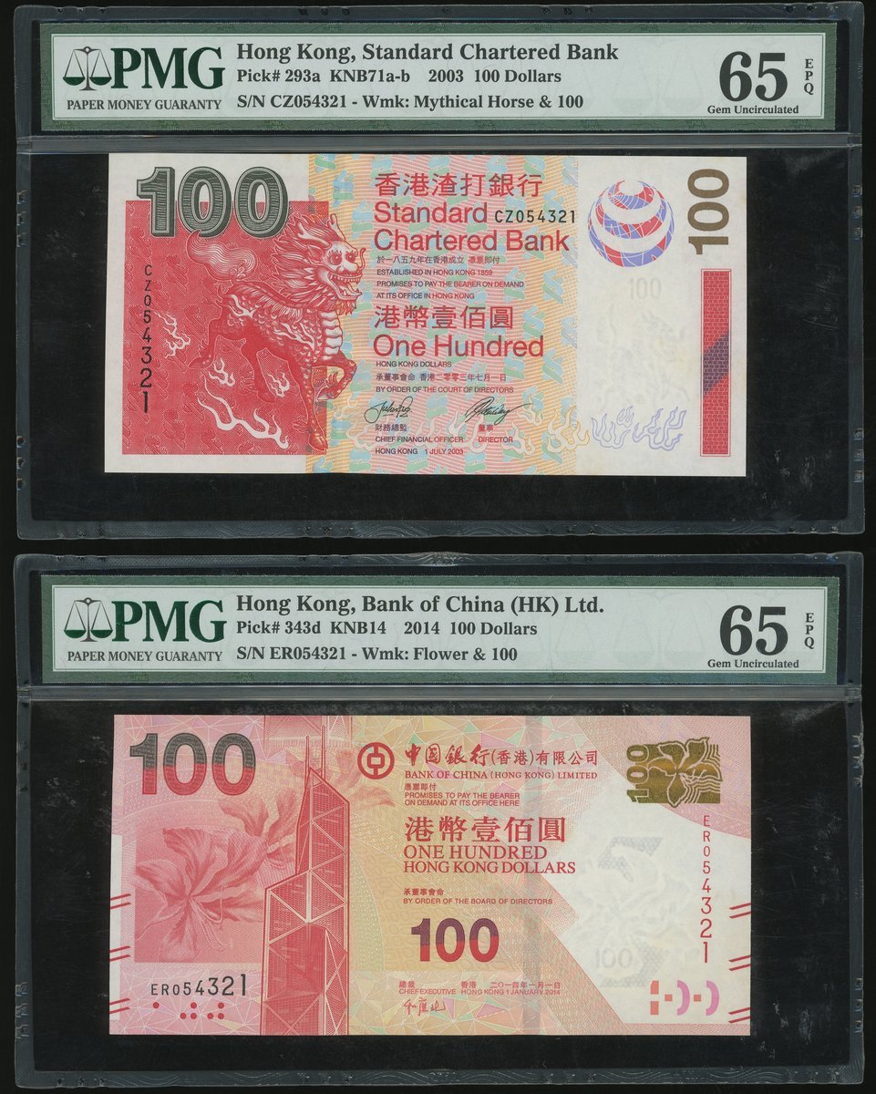 香港2014年中國銀行及2003年渣打銀行100元一對,相同編號054321,字軌分別為ER及CZ,均評PMG 65EPQ