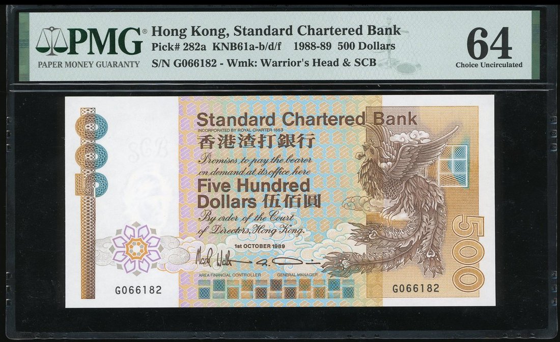 1989年渣打銀行500元,編號G066182,PMG64