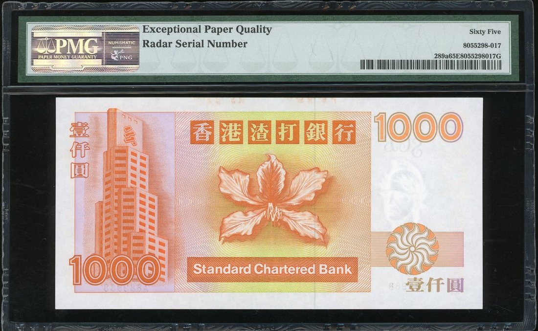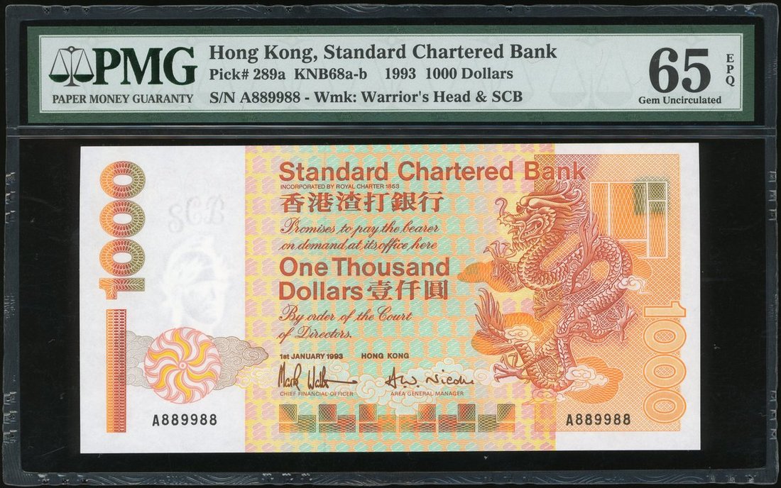 1993年渣打銀行1000元,雷達號 A889988,PMG 65EPQ