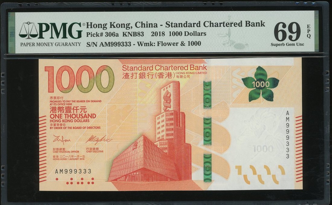 2018年渣打銀行1000元3枚,分別AM,AN及AP字軌,相同編號999333,均PMG 69EPQ