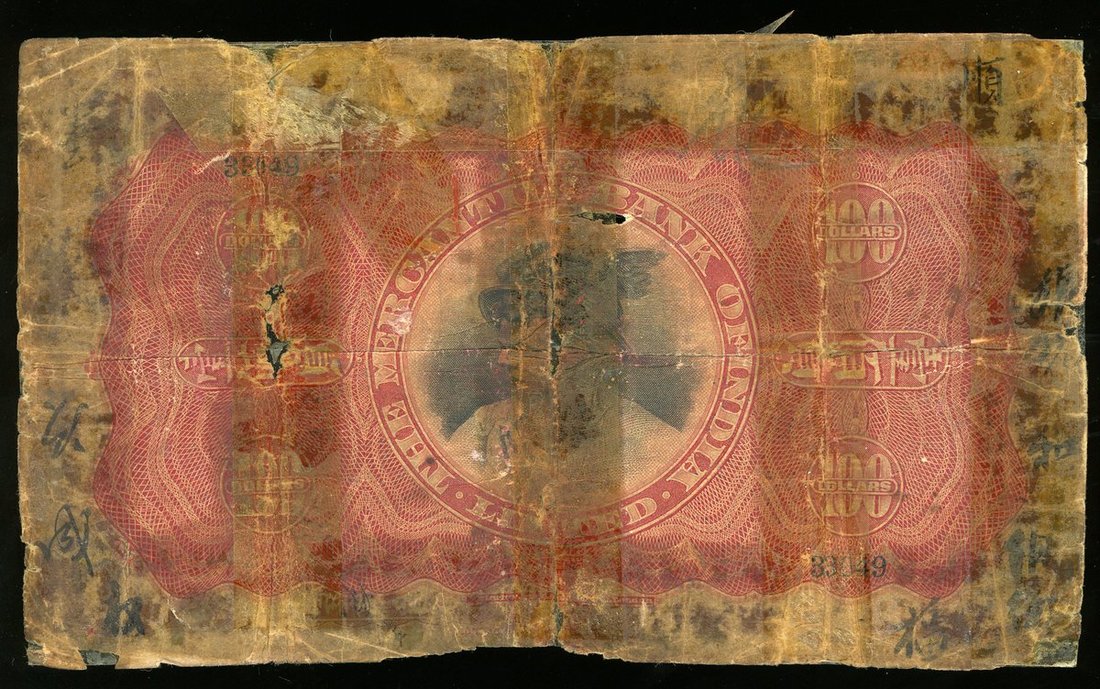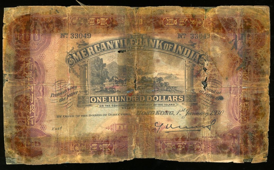 1930年有利銀行100元,編號33049,G品相,紙身有裂及有缺,有膠帶黏貼,罕見年份