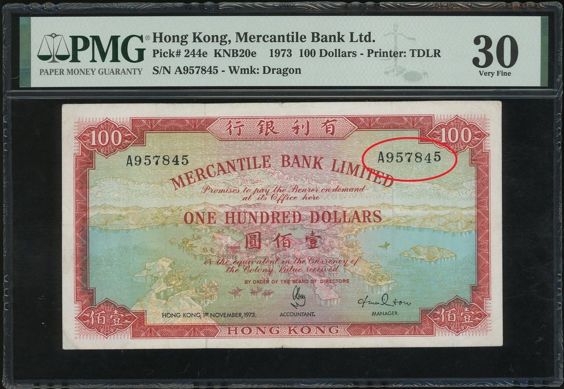 1973年有利銀行100元,編號A957845,右邊編號第五位數字下移錯體,PMG30,但評級公司並未註明錯體,售出後不接受退貨