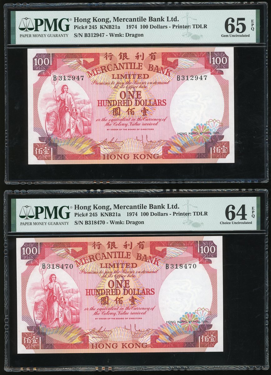 1974年有利銀行100元,編號B312947及B318470,分別評PMG 65EPQ 及 64EPQ