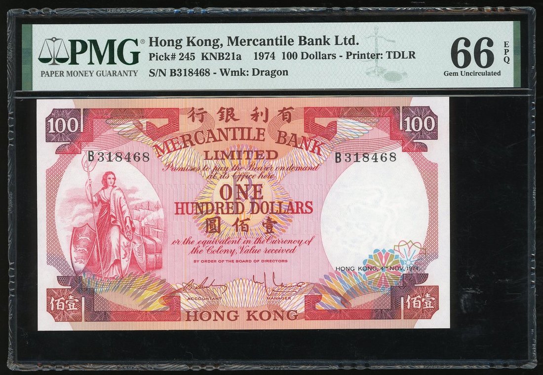 The Mercantile Bank Limited, $100, 4.11.1974, serial numbers B318468, (Pick 245), PMG 66EPQ Gem Uncirculated