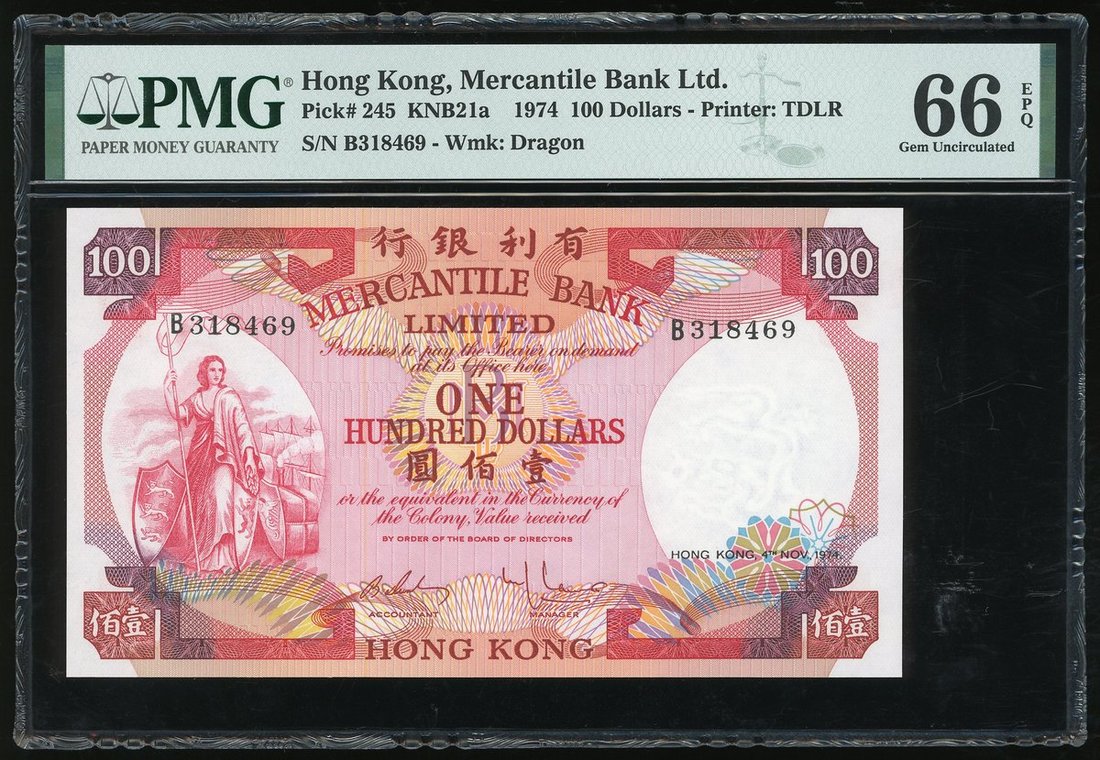 The Mercantile Bank Limited, $100, 4.11.1974, serial numbers B318469, (Pick 245), PMG 66EPQ Gem Uncirculated